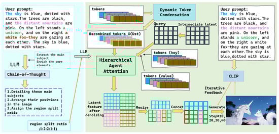 Overview of the Model Architecture Integrating Hierarchical Agent Attention Mechanism, Dynamic Token Condensation, and Iterative Feedback with CLIP Score. The input prompt is processed by a large language model to generate regional sub-prompts, which are encoded into tokens. Dynamic Token Condensation reduces redundant tokens while preserving key information, and the Hierarchical Agent Attention Mechanism aggregates features across regions for local and global coherence. The model is refined through iterative feedback with the CLIP score to improve semantic alignment and visual fidelity.