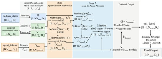 Hierarchical Agent Attention Mechanism. The attention mechanism consists of two stages: Stage 1 (Agent Global Compression) compresses the context information through attention from agent tokens to the encoder hidden states, producing agent features. Stage 2 (Main-to-Agent Attention) allows the main tokens to attend to these agent features, integrating the compressed contextual information. Finally, a residual fusion combines a weighted sum of the original values with the attended output, followed by linear projection and dropout to produce the final output. Dimensions of the tensors at each step are indicated in brackets.