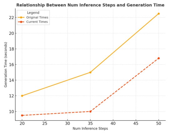 The relationship between the number of inference steps and generation time is illustrated in Figure 6. Compared to the original model, our method significantly reduces computational overhead, particularly as the number of inference steps increases. While the original approach exhibits a steep rise in generation time (from ~12 s to ~22.5 s), the current method maintains stable performance at lower step counts and shows much slower growth, achieving ~17 s at 50 steps—demonstrating improved efficiency and scalability.