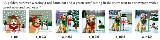 Effectiveness of Agent Ratio (a_r). The experiments on varying a_r demonstrate its significant impact on the quality of generated images. As shown in Figure 7, with the prompt “A golden retriever wearing a red Santa hat and a green scarf, sitting in the snow next to a snowman with a carrot nose and coal eyes”, the following trends were observed: At a low a_r of 0.2–0.4, images lack sufficient detail, and features such as the Santa hat and snowman are either incomplete or poorly rendered, resulting in weak semantic consistency and attribute binding. At the optimal a_r range of 0.6–0.8, images achieve the best balance between detail and coherence, with accurately rendered features like the red Santa hat, green scarf, and snowman’s facial details, while maximizing semantic consistency, attribute binding, and object interaction. However, with a high a_r of 1.0, overfitting begins to occur, causing slight misalignments or unnecessary details, although the overall quality remains acceptable.