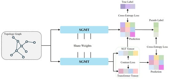 SGMT-IDS consists of four components, and its overall architecture is illustrated in Figure 1. First, we construct a network topology graph G based on the IP communication relationships among network hosts to preserve the topological structure of network behaviors. Then, the SGT branch is used to aggregate node information and obtain the topological representation of network traffic. On this basis, we employ the GML-Transformer to extract the contextual semantic information of network behaviors. After fusing the two different representations of network behaviors, the model is trained in two stages. In the first stage, labeled samples are used to guide supervised learning. In the second stage, pseudo-labels serve as soft supervisory signals, and contrastive learning is applied to maximize the information contained in unlabeled data. Finally, the fused node embeddings generated by the dual branches are fed into a classifier to accomplish the intrusion detection task.