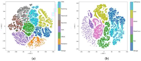 (a) Dimensionality reduction visualization of features in the NF-ToN-IoT-V2 dataset. (b) Dimensionality reduction visualization of features in the NF-CSE-CIC-IDS2018-V2 dataset.