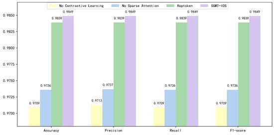 To further examine the contribution of each module to the overall performance, we conducted a more detailed ablation study on the NF-ToN-IoT-V2 dataset, focusing on the sparse attention structure in the SGT branch, the semantic hop aggregation mechanism of the Semantic-HopToken, and the contrastive learning objective. The results are presented in Figure 7.