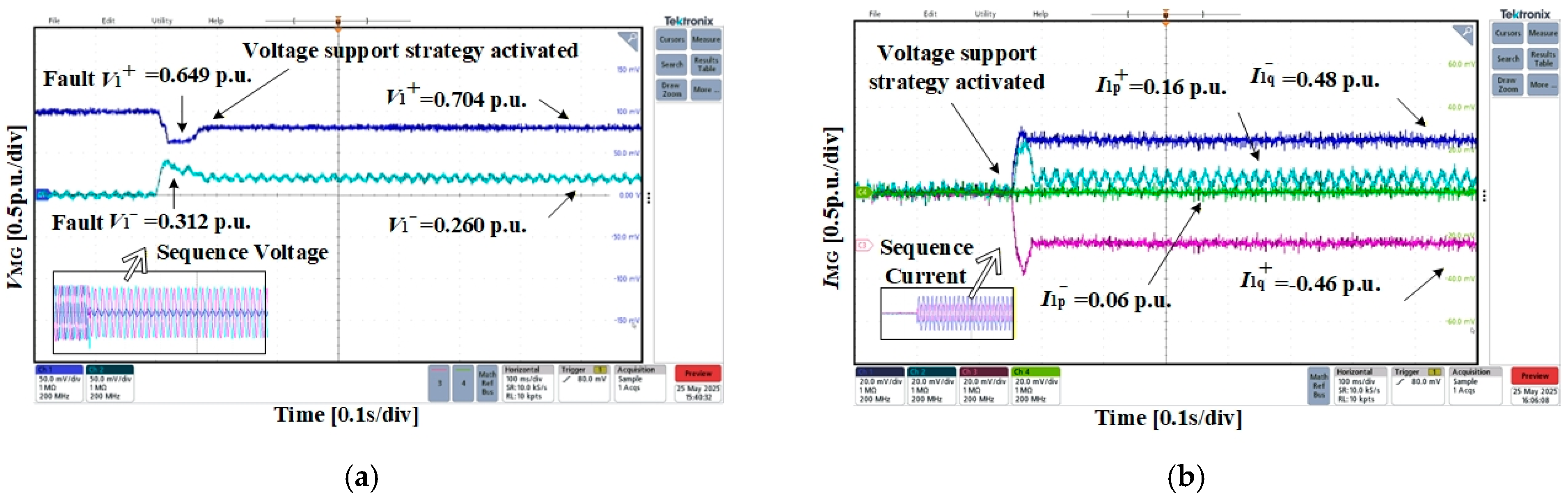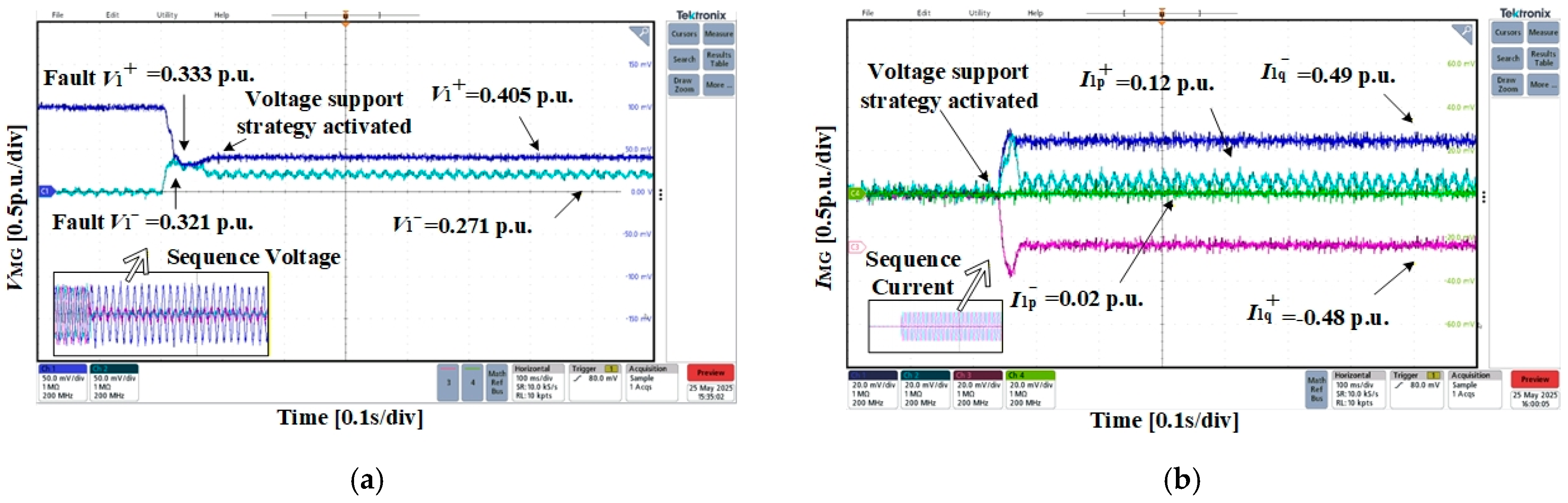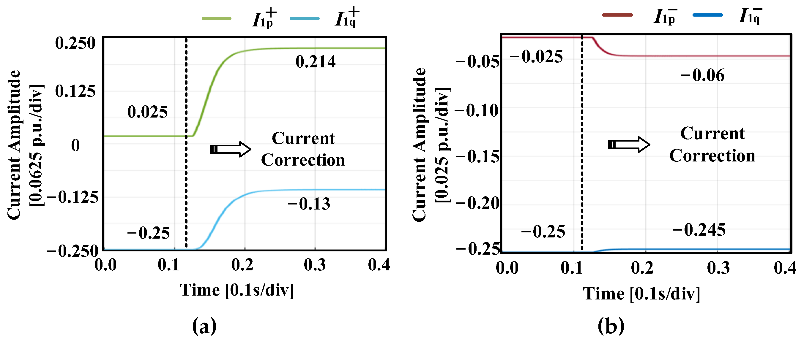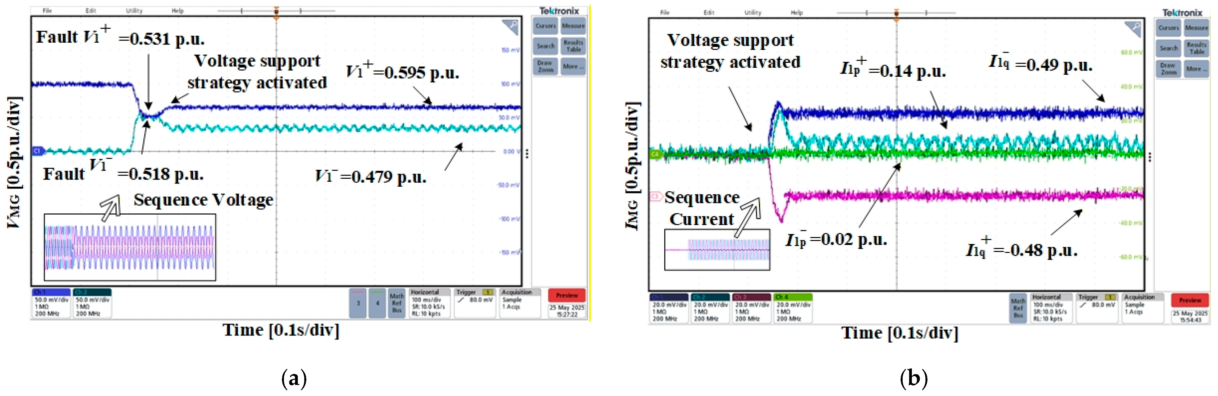 - Case 3: Phase-to-phase short-circuit fault in the fault microgridsIn Case 3, the positive-sequence voltage of the microgrid drops to 0.531 p.u., while the negative-sequence voltage rises to 0.518 p.u. As shown in Figure 16, the injected current components are: Ip+ = 0.14 p.u., Iq+ = −0.48 p.u., Ip− = −0.02 p.u., Iq− = −0.49 p.u. Following current injection, the positive-sequence voltage recovers to 0.595 p.u., while the negative-sequence voltage decreases to 0.479 p.u. The resulting current ratios are k1+ = −3.4 and k1− = 25, which again deviate from the theoretically calculated values, as well as the rest of the fault conditions.These results collectively confirm the adaptability of the proposed transient voltage support method across diverse fault scenarios, validating its practical applicability in cable-interconnected microgrids.