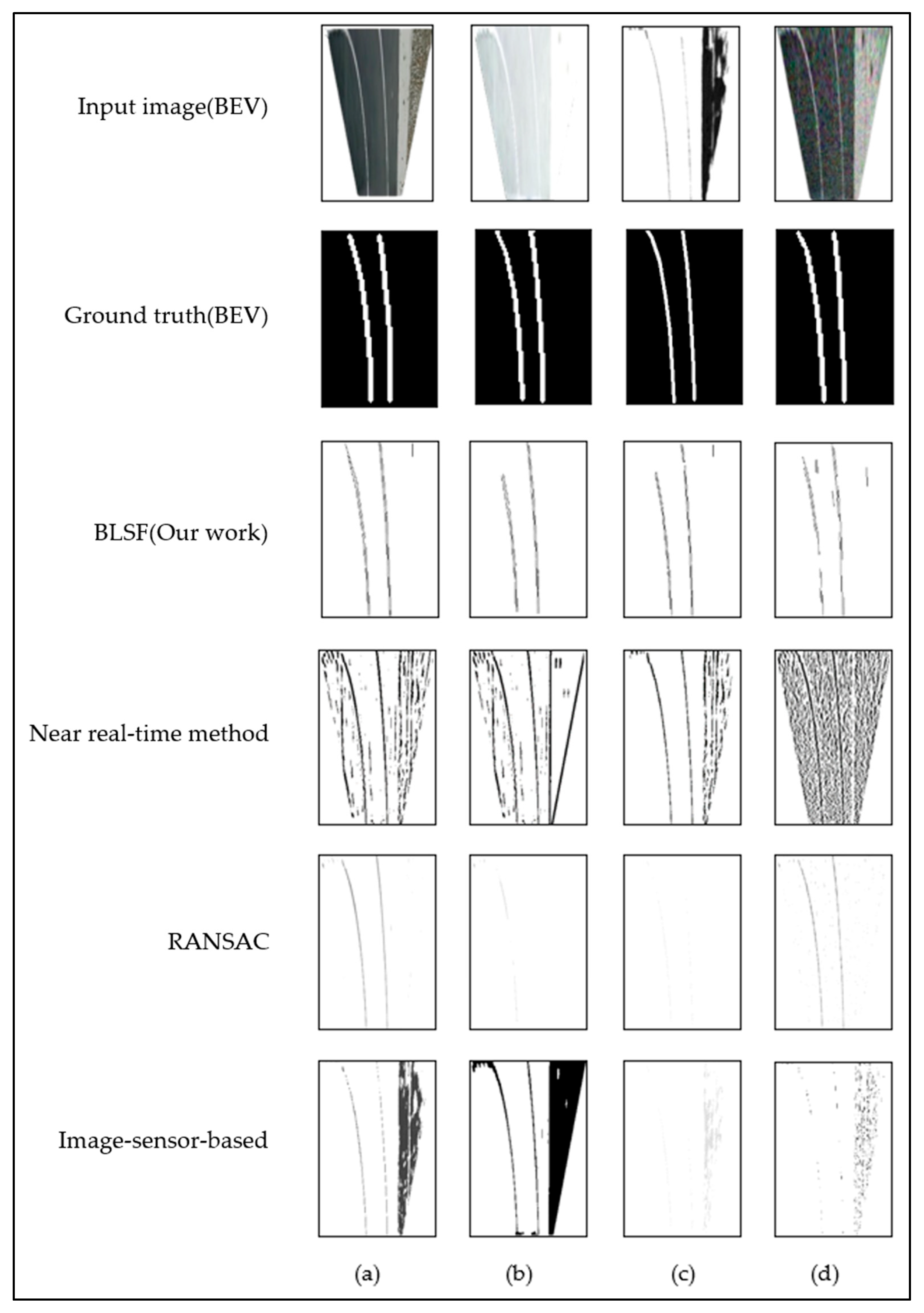 - We demonstrate that combining median local thresholding with BLSF significantly improves robustness against strong backlighting, low-contrast night scenes, heavy rain, and high-curvature lanes, without relying on learning-based feature extraction.