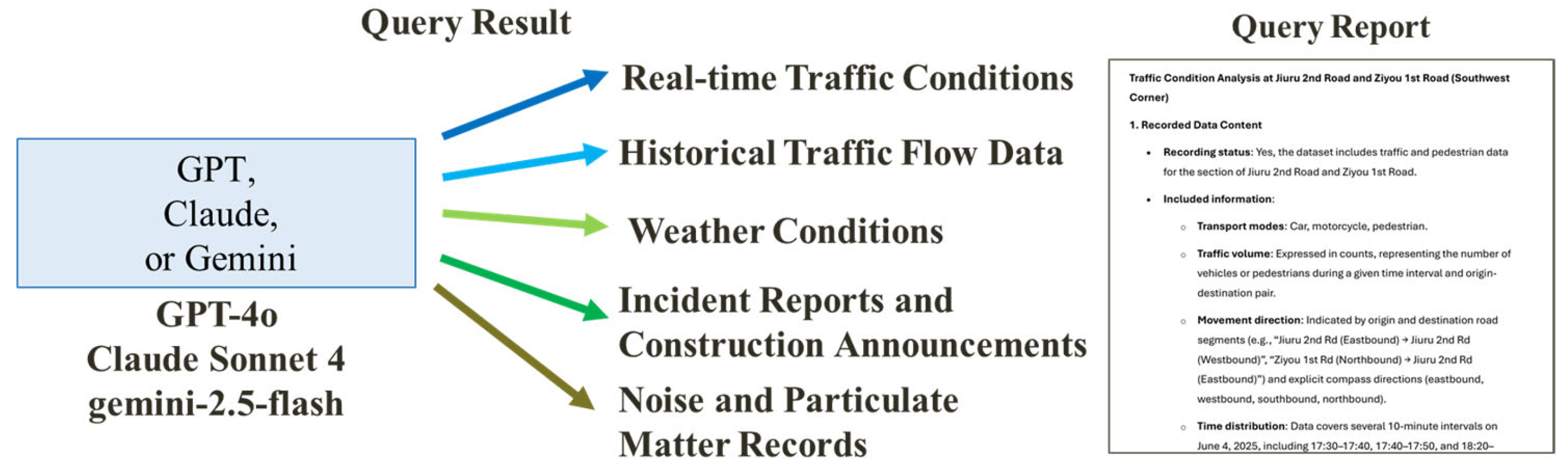 | Data Description | Simplified summary focusing on covered time, tool types, and directions | Very clear, listing data sources and analysis details | Provides actual numerical examples (e.g., 17:00–17:10, vehicle and pedestrian flow data) |
