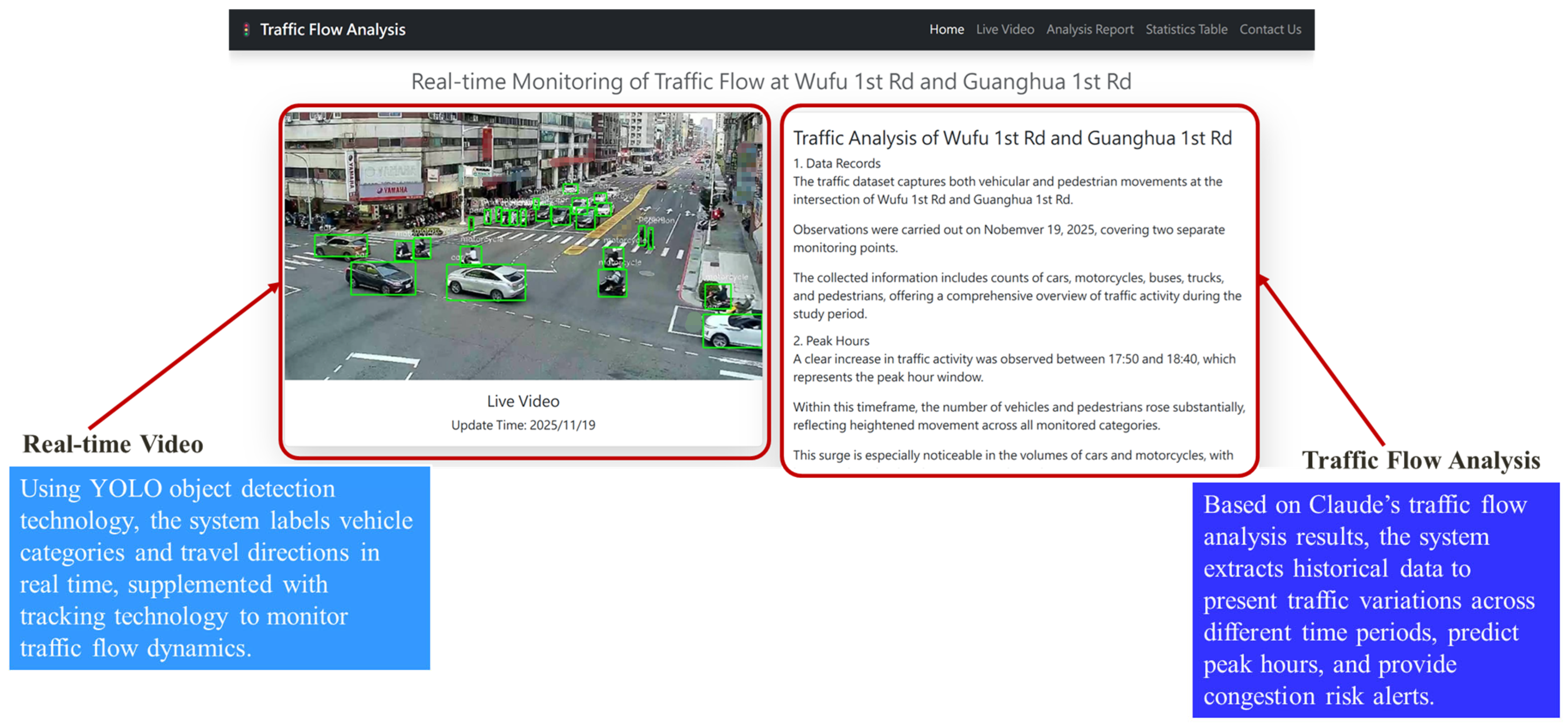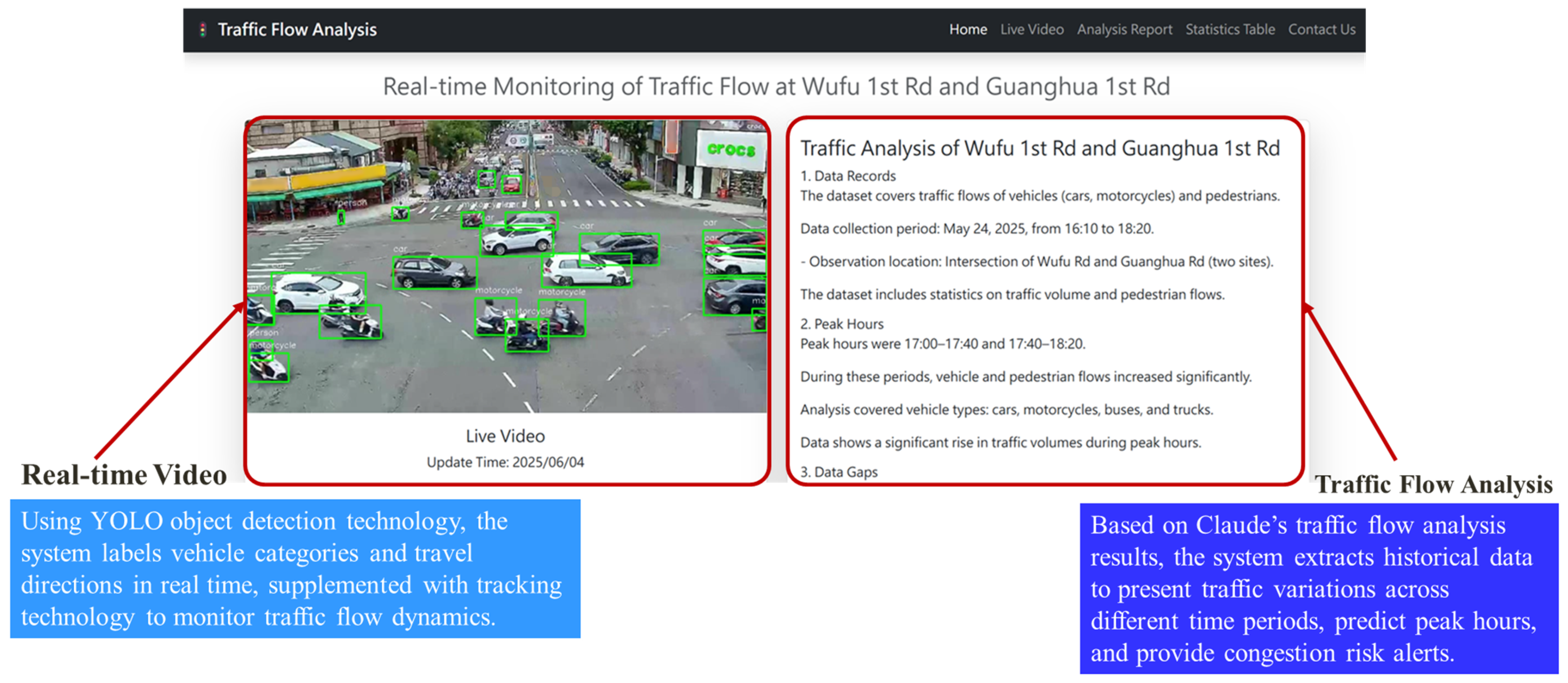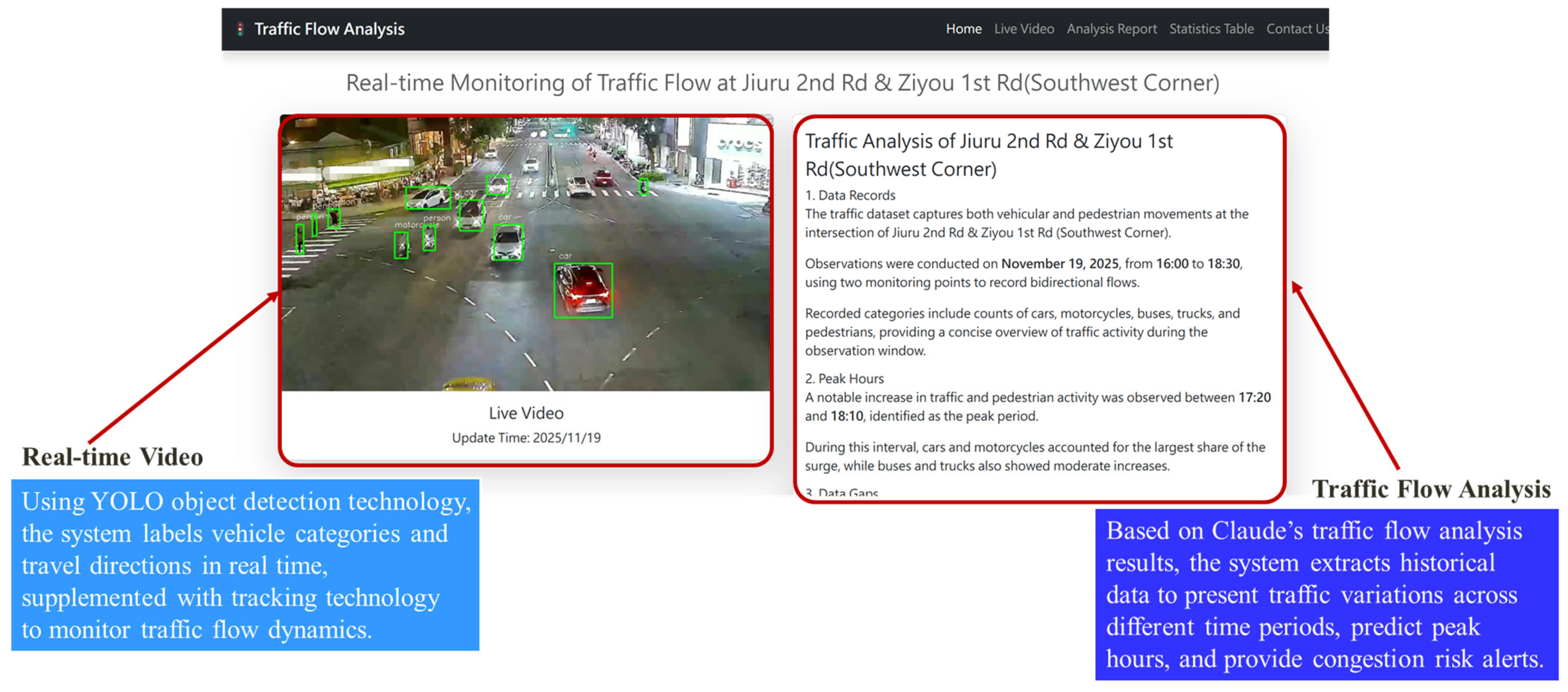| Peak Hour Analysis | Simplified as mainly 18:10–19:00 | Pinpoints 18:10–19:00, highlighting peak for vehicles and motorcycles | Identifies dual peaks at 07:00–09:00 and 17:00–19:00 |