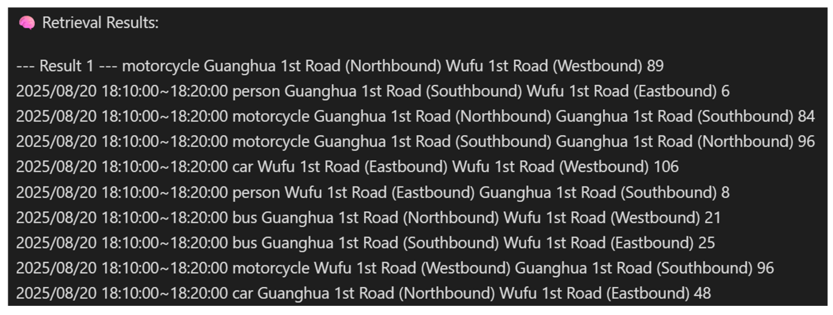 - Count: the number of cars passing through the specified entry and exit directions during the time interval.