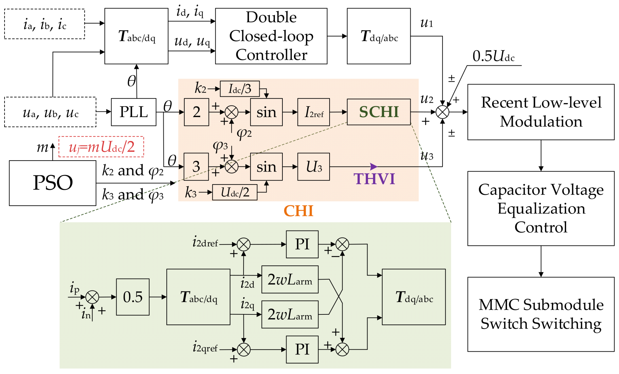 - Building upon the third-harmonic voltage, the injected second-order circulating current further modifies the modulation wave through the arm inductance. This interaction introduces significant coupling between the CHI parameters and the modulation index. By incorporating switching function modeling and modulation margin constraints, this paper refines the feasible ranges of these parameters and then employs PSO to effectively solve the resulting constrained optimization problem.