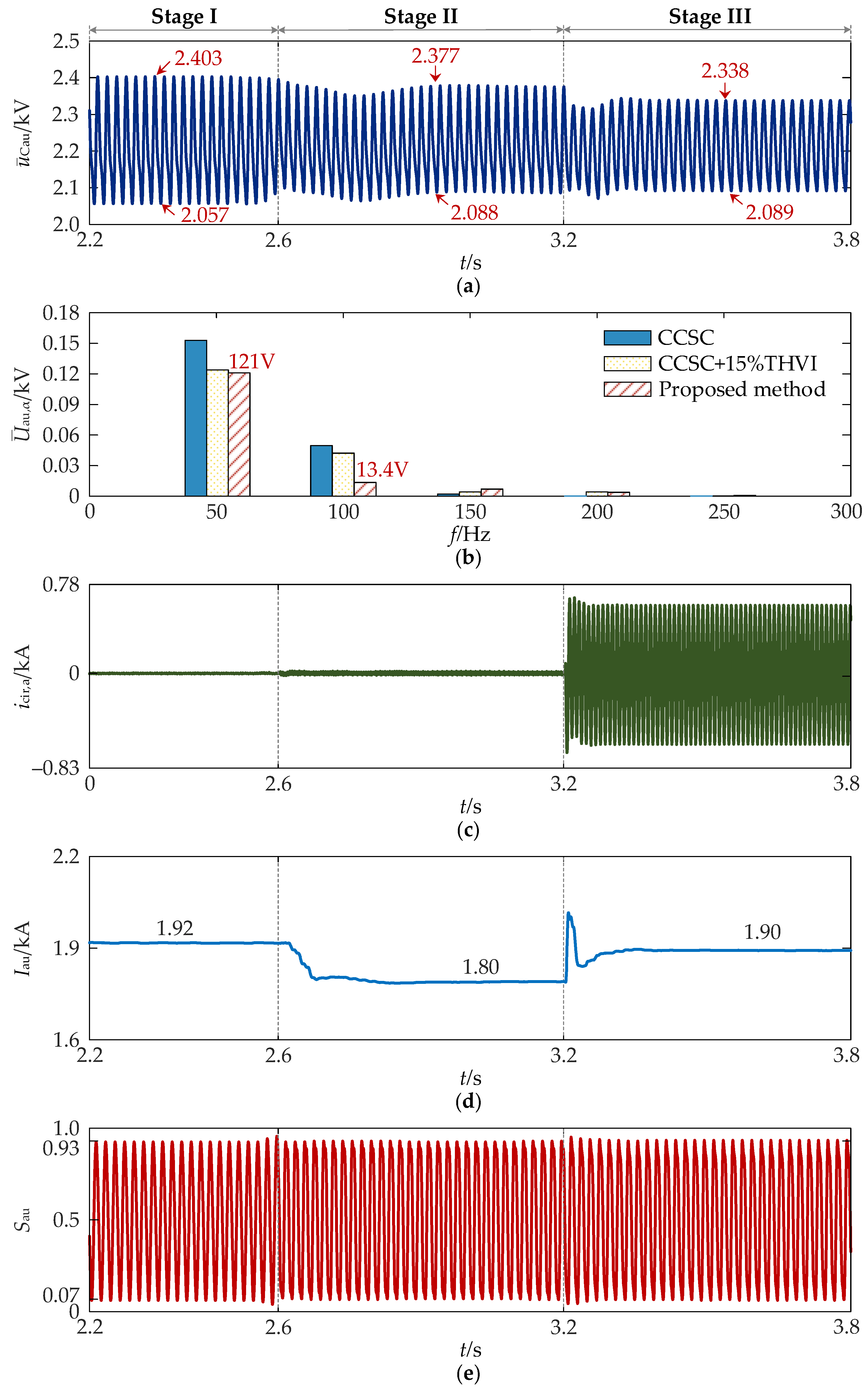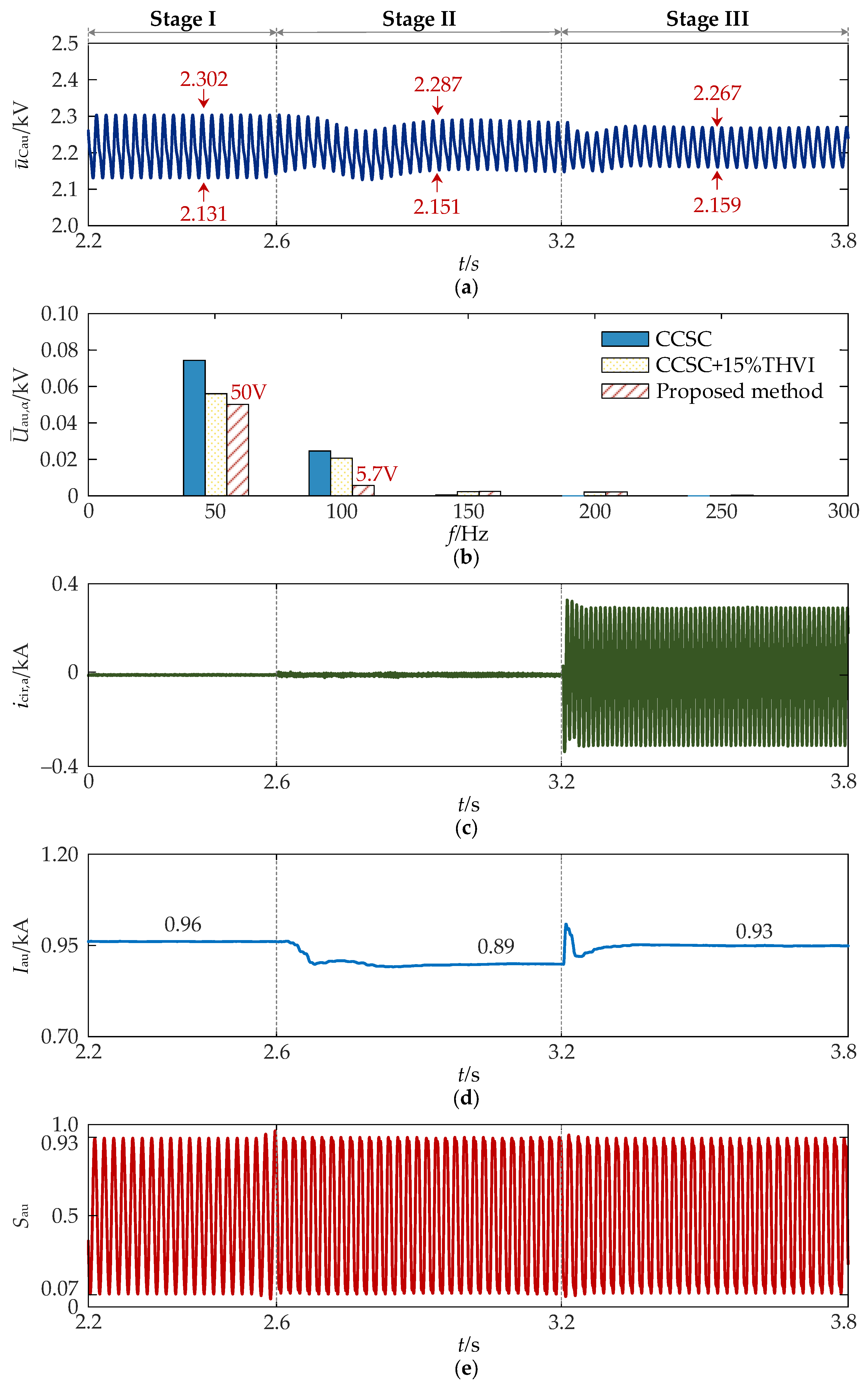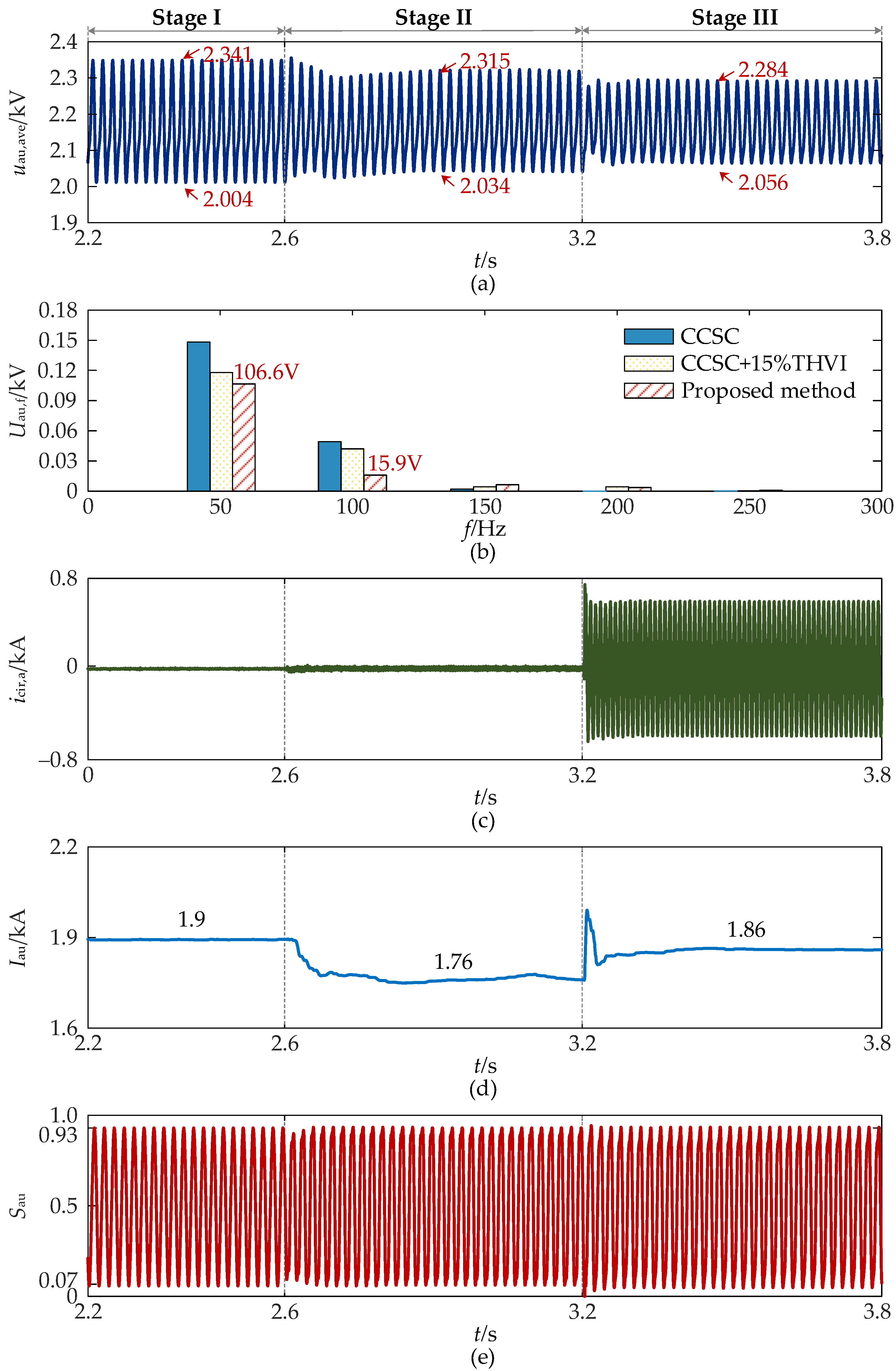- Simulation results under different power conditions demonstrate that, compared with the conventional CCSC strategy combined with 15% THVI, the proposed method further reduces the second-order harmonic component of the SM capacitor voltage, leading to enhanced voltage fluctuation suppression. Even with a 13.33% reduction in SM capacitance (from 15 mF to 13 mF), the resulting voltage fluctuation using the proposed method remains lower than that of the CCSC strategy with 15% THVI prior to capacitance reduction. This capacitance reduction translates directly into an estimated 6.65% decrease in overall MMC volume and a 3.99% reduction in system cost, confirming the potential of the proposed method for MMC lightweighting and cost efficiency.