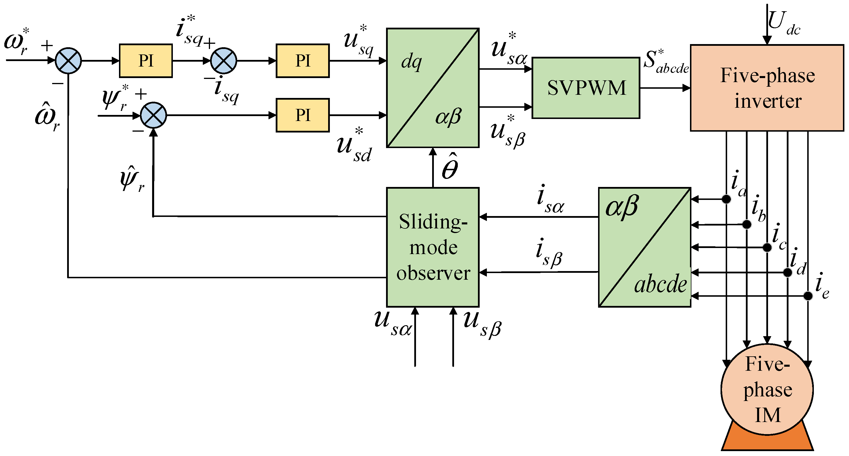 Figure 1 shows the block diagram of sensorless speed control for a five-phase induction motor based on a sliding-mode observer. In conventional systems, the feedback for the speed loop is provided by a speed sensor. Here, however, a sliding mode observer is constructed to replace the physical sensor. The inputs to the observer are the stator voltage and stator current in the