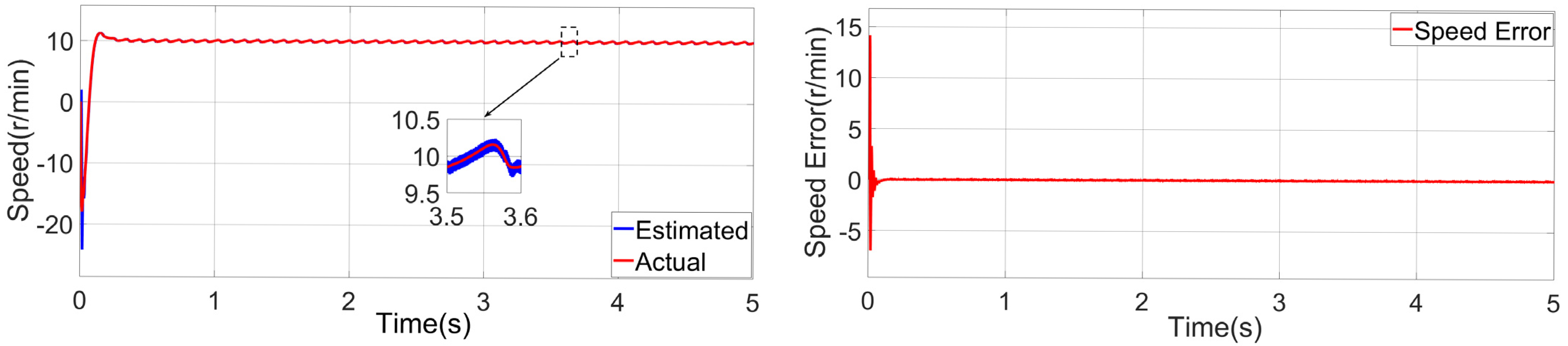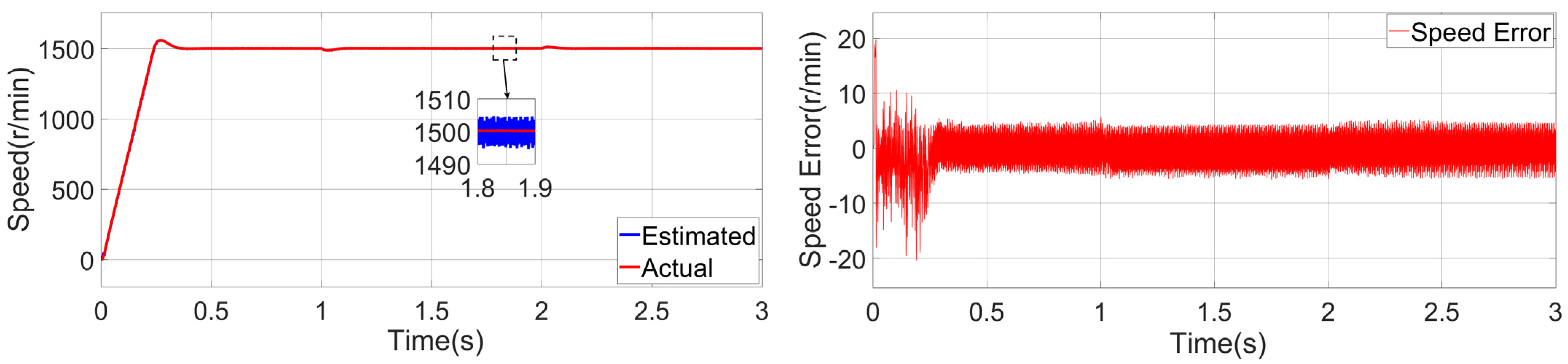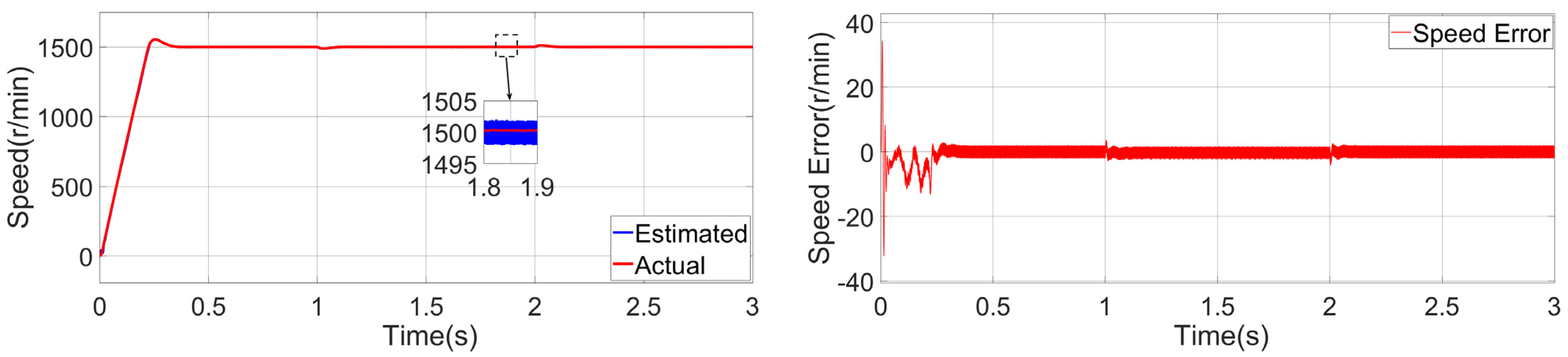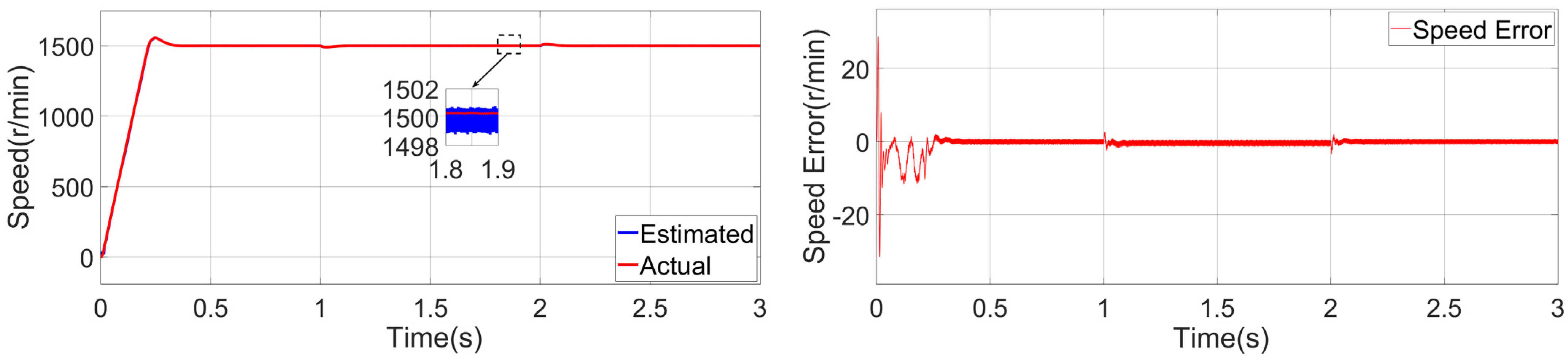 The operating conditions are set as follows: the motor starts under no-load conditions, followed by switching between different speeds to verify the observer’s speed tracking performance. The initial speed is set to 500 r/min. After 1 s, it increases to 1500 r/min; after 2 s, it further rises to 2500 r/min; after 3 s, it decreases to 2000 r/min; and finally, after 4 s, it drops to 1000 r/min. The simulation results are shown in the figure below.