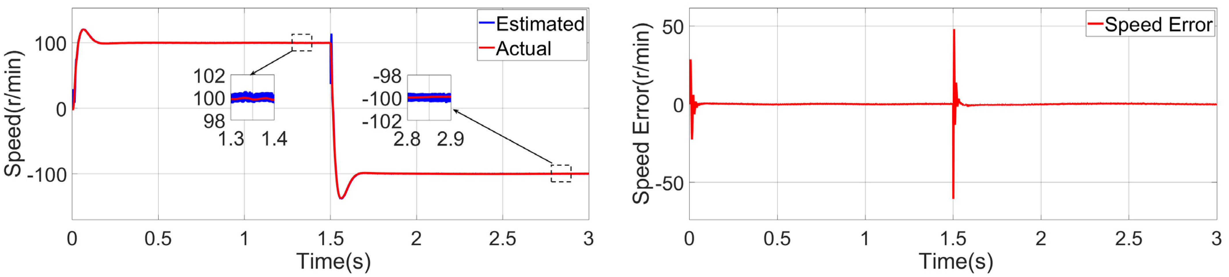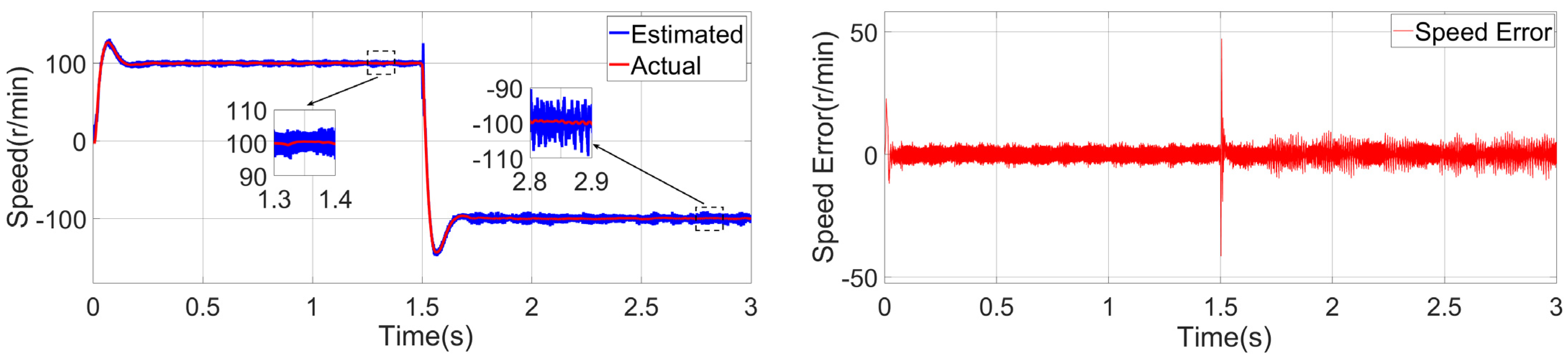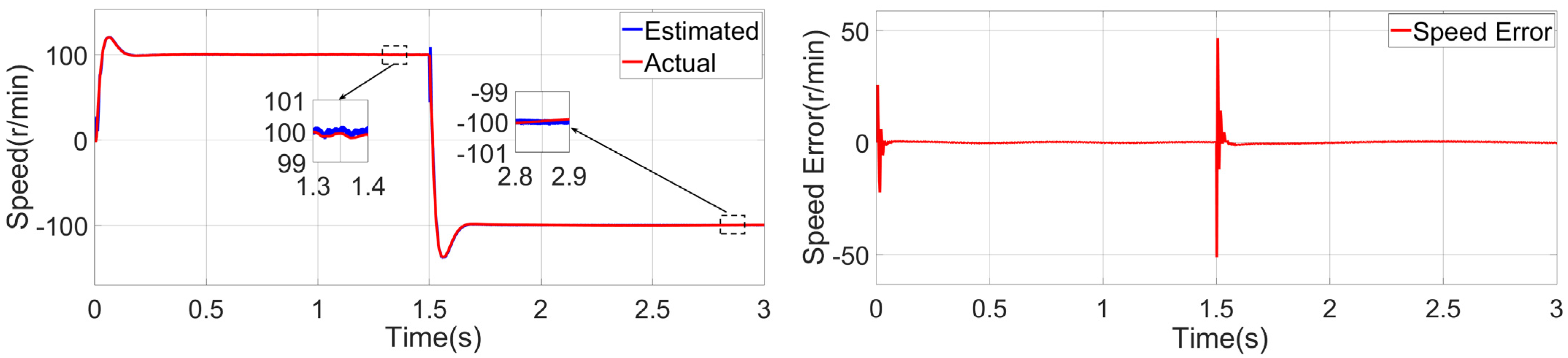 To verify the performance of the designed observer during motor forward and reverse rotation, the following operating condition is set: the motor starts with a 50% rated load at an initial speed of 100 r/min, and the speed is switched to −100 r/min at 1.5 s. The simulation results are shown in the figure below.