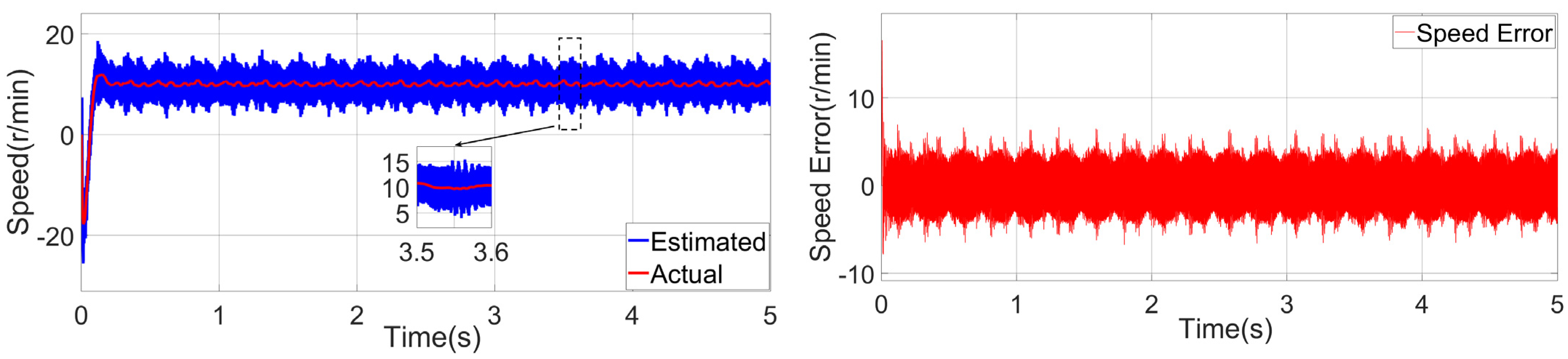To verify the performance of the designed observer under extremely low-speed operation with rated load, the motor was started under rated load conditions with an initial speed of 10 r/min. The simulation results are shown in the figure below.