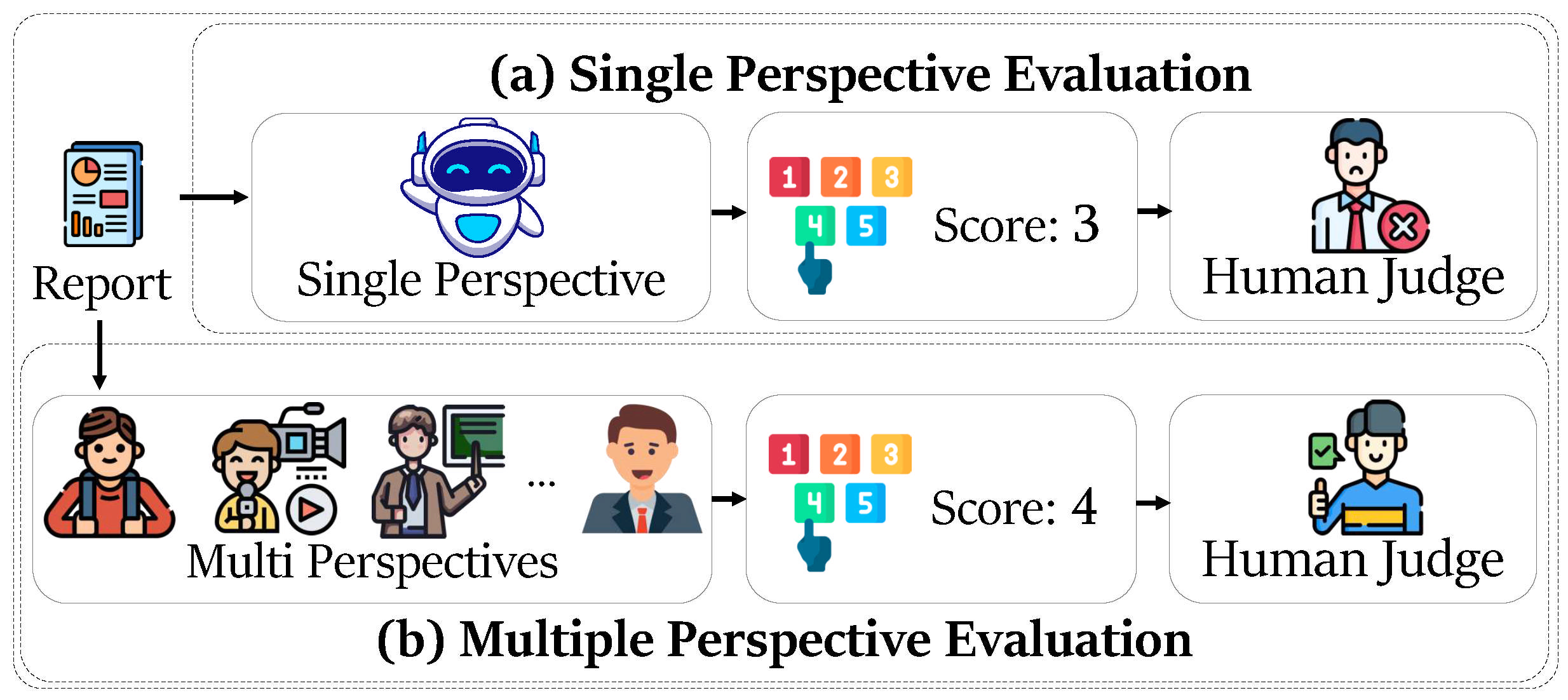 - We propose a multi-perspective evaluation framework that addresses open-ended dimensions evaluation challenges by dynamically generating roles to capture diverse, context-specific stakeholder viewpoints.