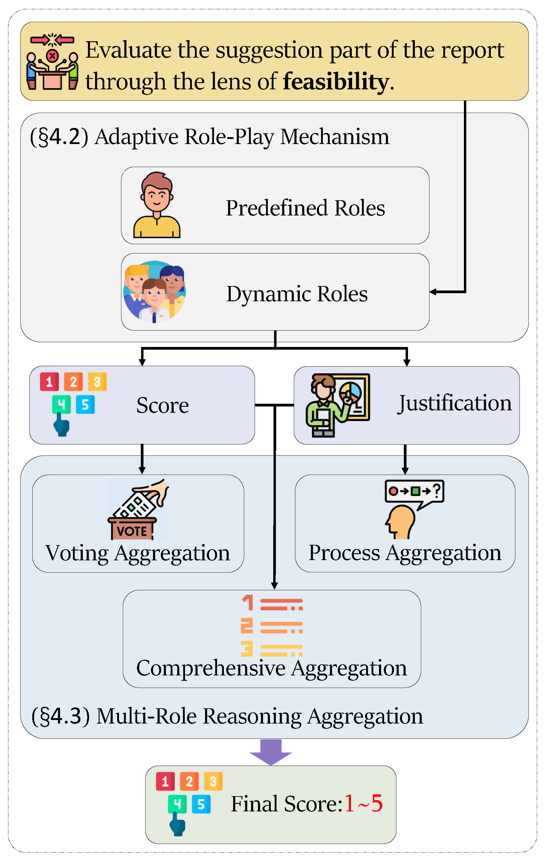 - We introduce a multi-role reasoning aggregation mechanism that, for each evaluation dimension, synthesizes perspectives from multiple roles into a comprehensive dimension-specific score.