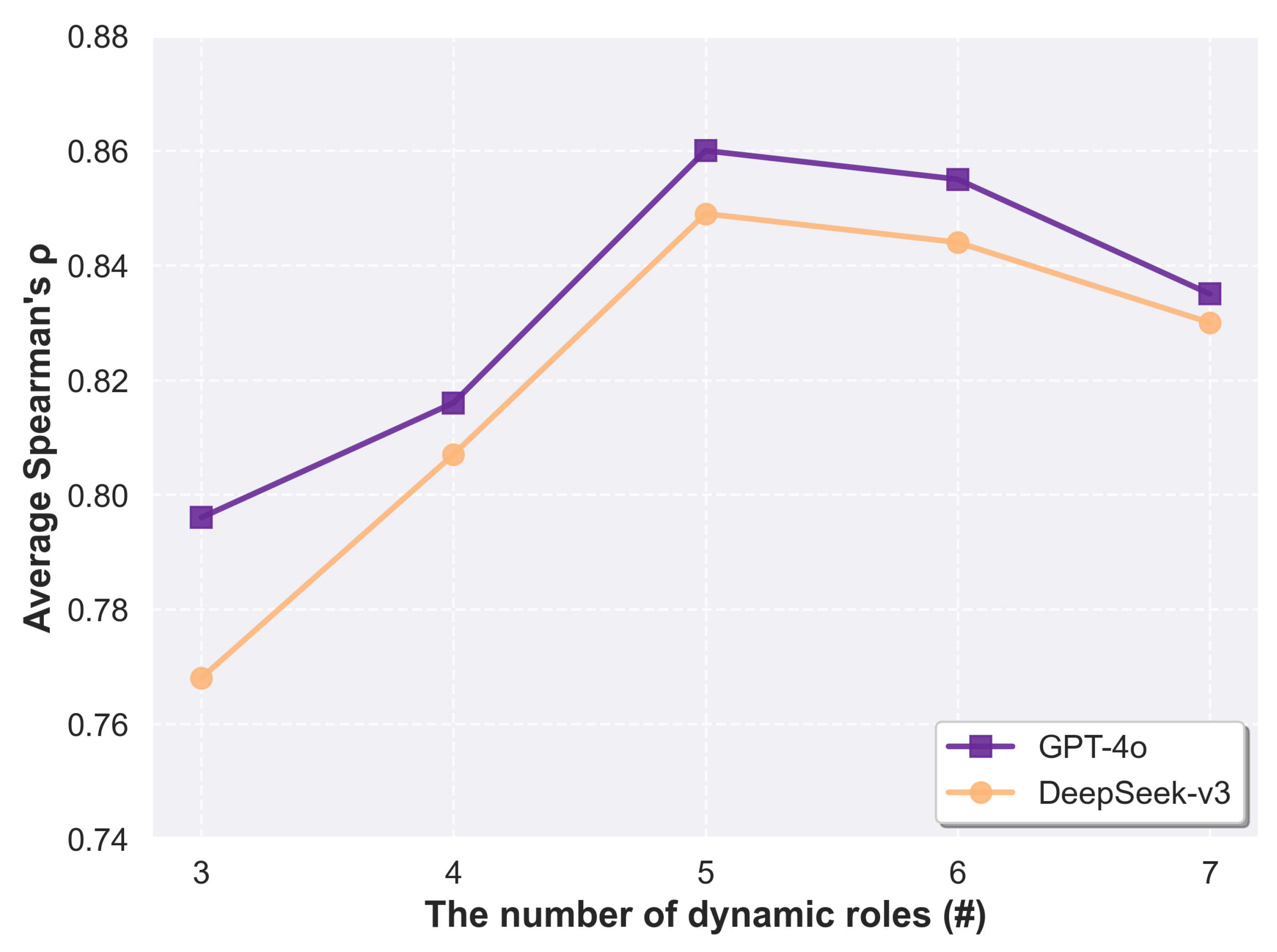 - H2: Does increasing the number of dynamic roles continuously improve evaluation performance, or is there an optimal threshold?