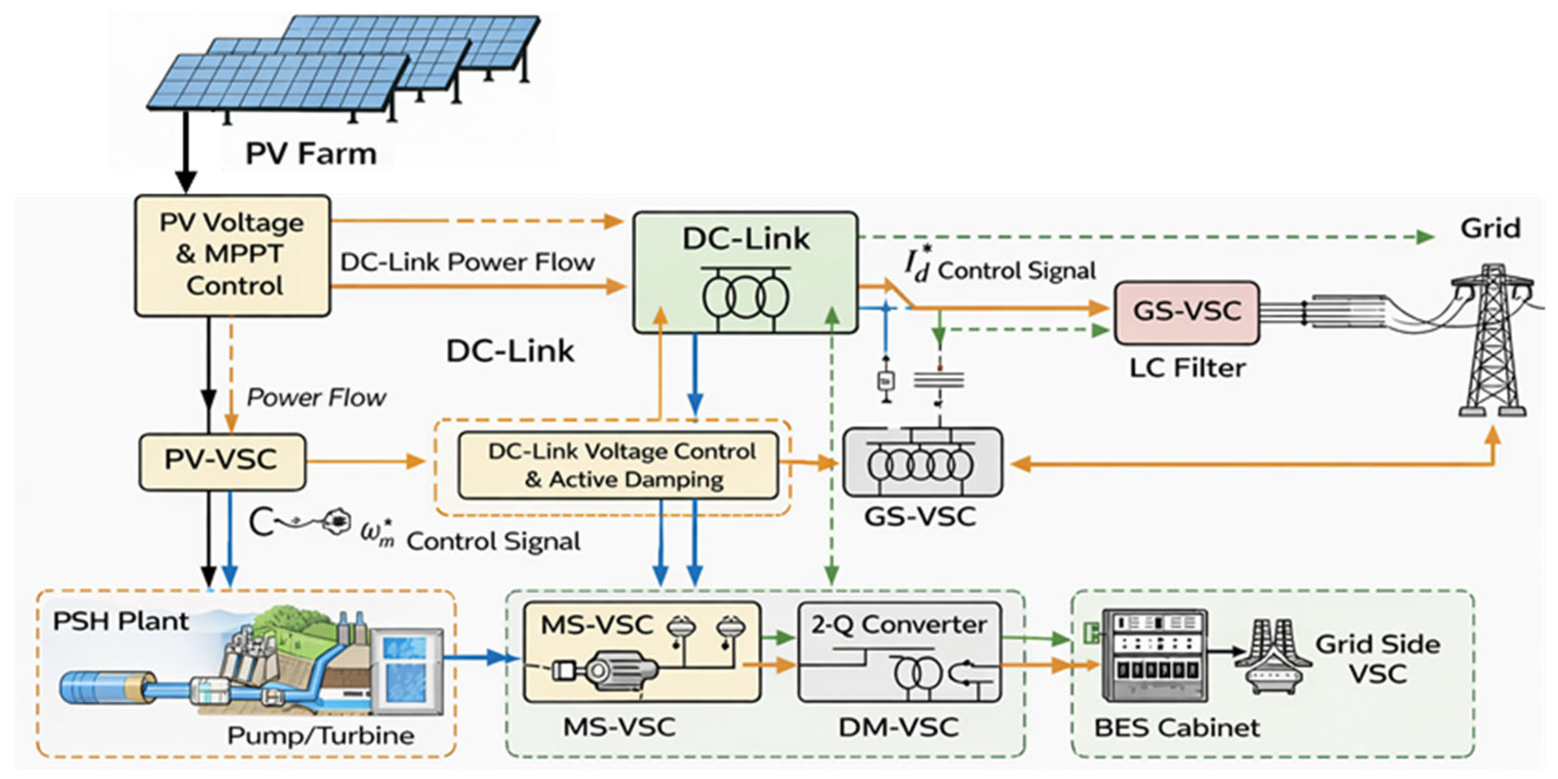 6]. In hybrid energy configurations, integrating the PV generator with PSH and BES units at a shared DC–link, connected to the grid via a grid-side voltage-source converter (GS-VSC), enables robust grid support and stable operation across diverse conditions [