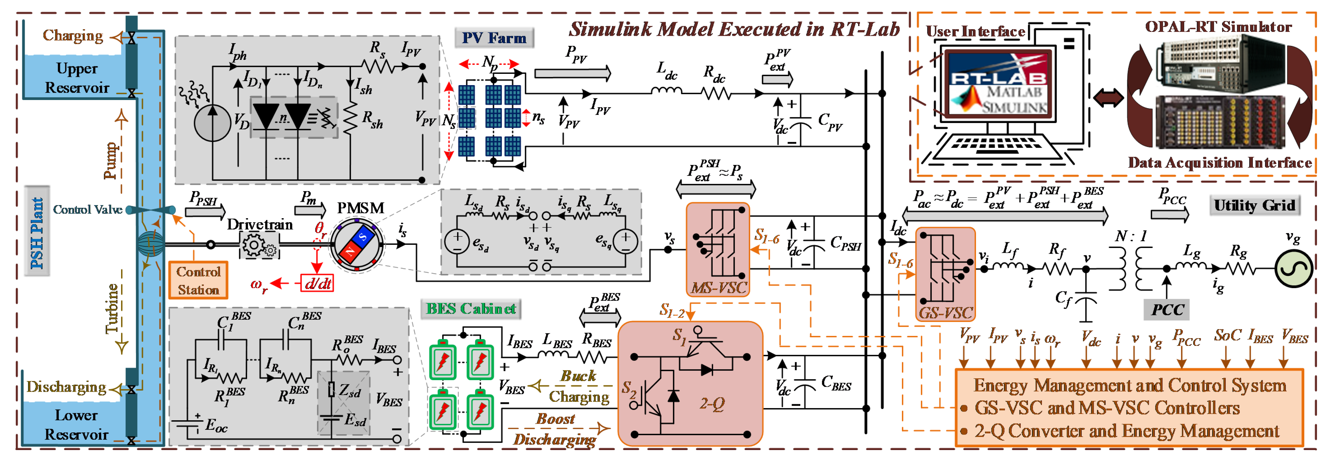 The configuration of the VSC-based grid-connected hybrid system, comprising a single-stage PV-PSDM, PSH-PMSM, and Lithium-ion BES, is implemented on the OPAL-RT real-time simulation platform (RT-LAB 2021) integrated with MATLAB/Simulink R2021b, as shown in