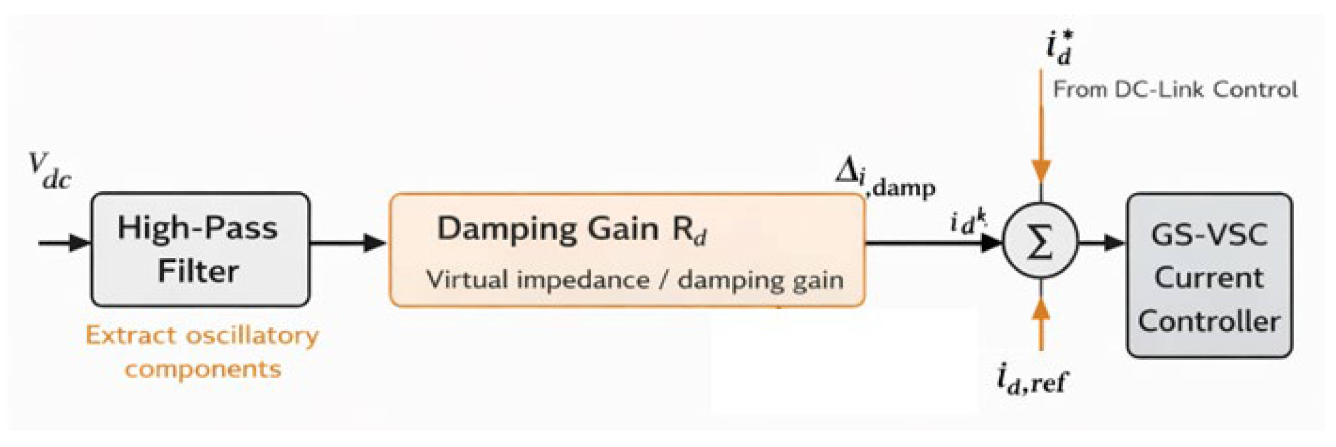 The resulting damping signal is superimposed onto the active current reference of the GS-VSC through a summation block, effectively injecting an auxiliary damping current component into the converter control loop. This injected signal counteracts oscillatory power exchange between the DC–link and the grid, suppresses resonant modes, and repositions critical unstable eigenmodes toward the left half of the complex plane. In parallel, the active damping mechanism reshapes the DC–link impedance dynamics to comply with the Nyquist stability criterion, thereby ensuring a positive effective damping characteristic of the GS-VSC even under weak grid conditions.