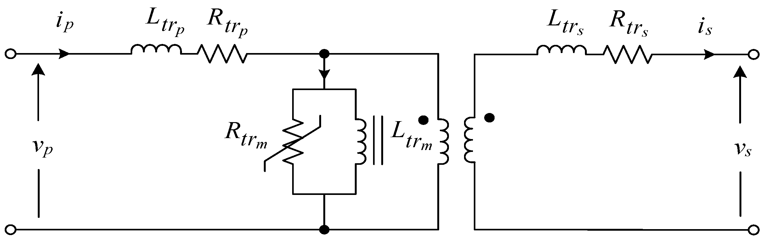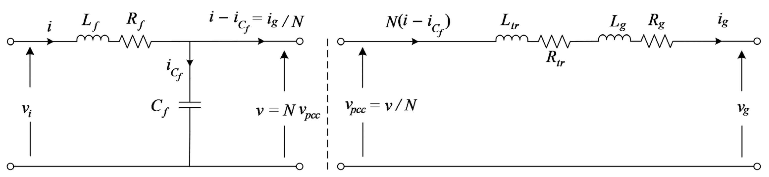 Figure 6 shows the detailed equivalent circuit of the transformer, which includes the primary and secondary winding impedances, as well as the magnetizing branch. For simulation and control design purposes, the transformer model can be referred to either the primary or secondary side. In this study, it is referred to the secondary side, and the magnetizing branch is neglected. This simplification allows the transformer’s dynamics to be integrated directly with the utility grid impedance for a more practical and efficient modeling approach.