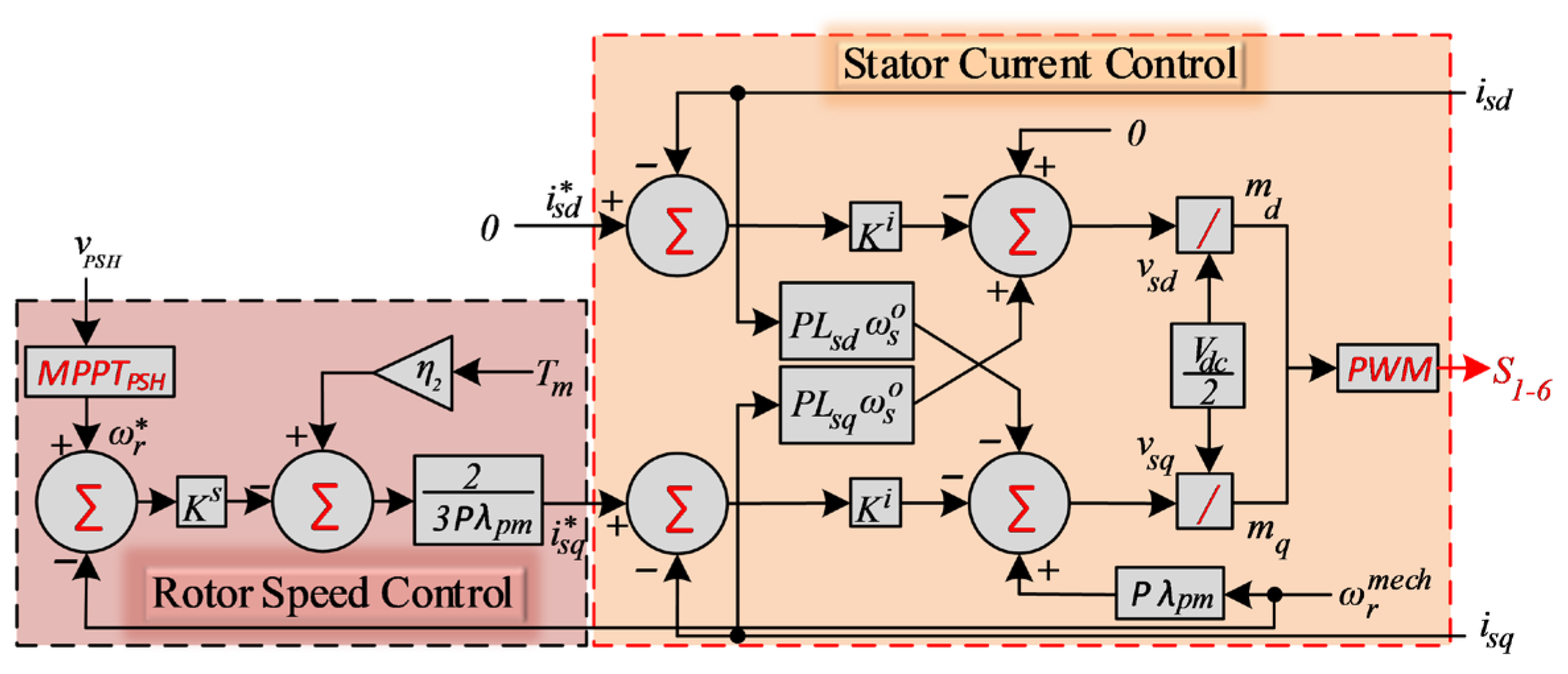Unlike traditional unidirectional generators, the PSH subsystem in this configuration supports both generation and pumping modes, depending on operational requirements. As such, may be positive (during turbine generation) or negative (during water pumping). When generating, the external power is approximated by the real component of the stator power of the PMSM, i.e., . When in pumping mode, the PSH absorbs power from the DC–link to raise water back to the upper reservoir.
