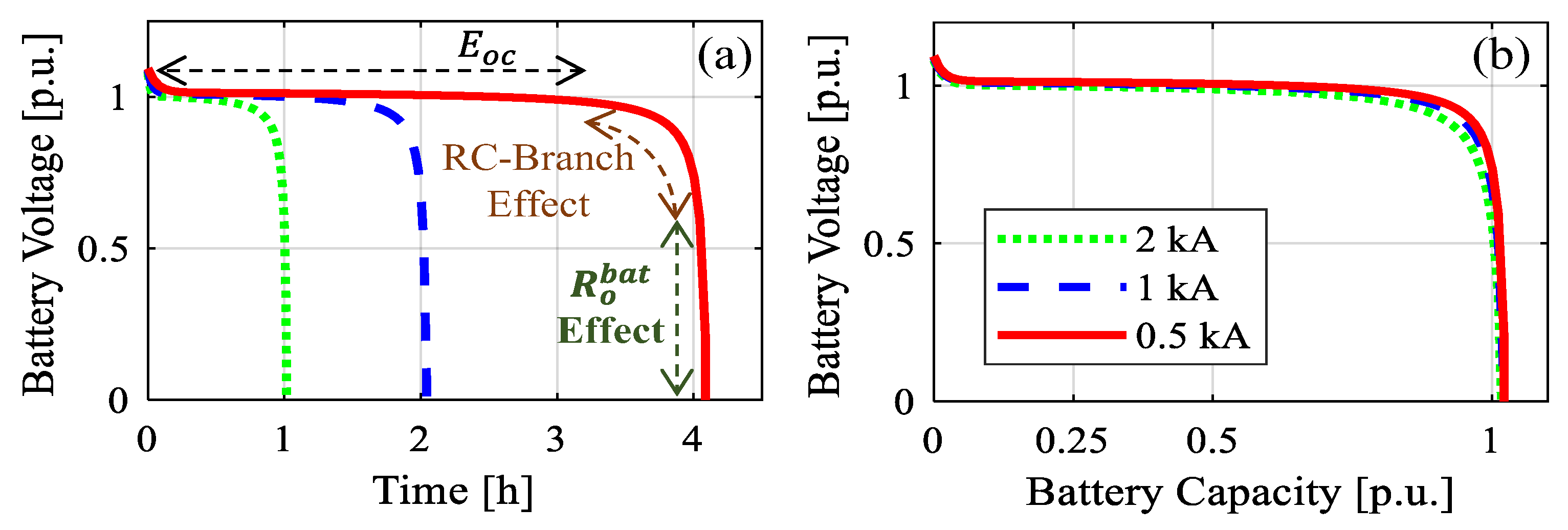 Figure 12, which demonstrates how increasing current levels (0.5 kA, 1 kA, 2 kA) accelerate the voltage drop and expose the combined influence of the internal resistance and RC-branch effects. Specifically,