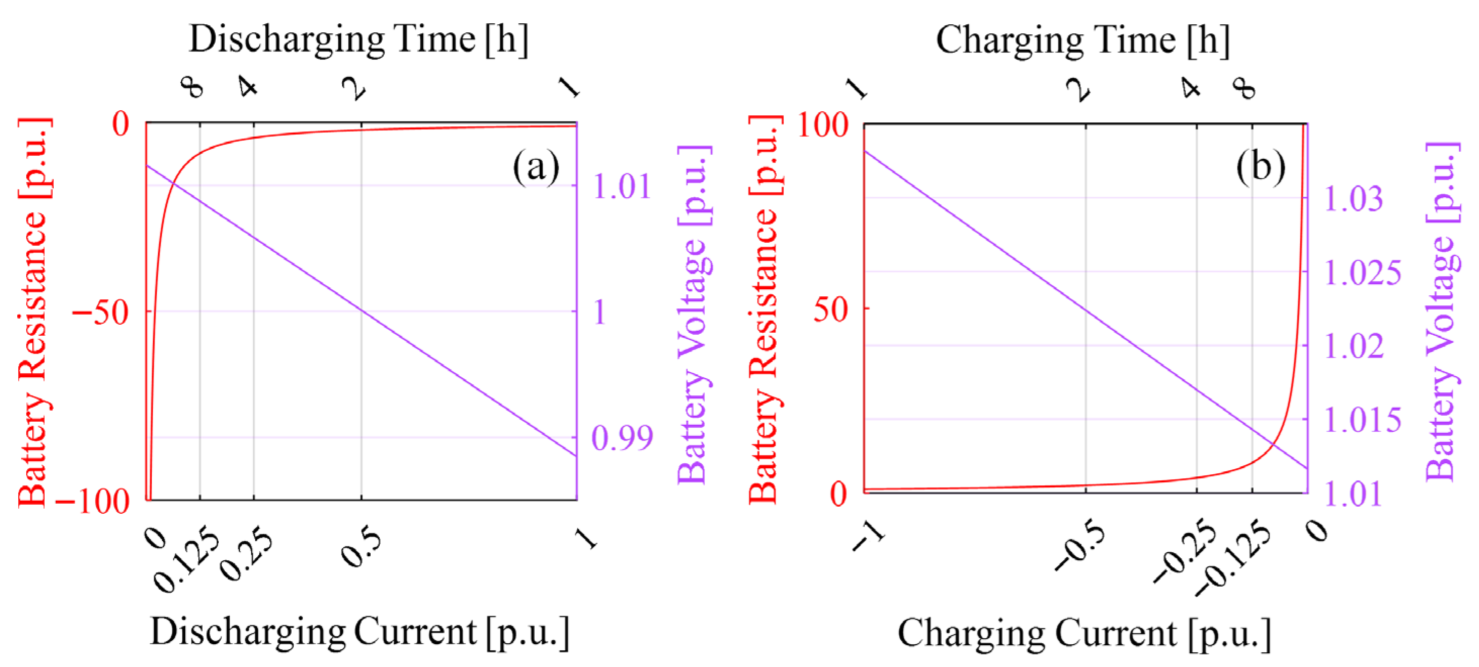 . The resistance-current characteristics during both discharging and charging phases are captured, showing how resistance values vary nonlinearly and even change signs depending on the direction of current. These curves help reveal the dual behavior of the battery as an active or passive element in different modes, which is critical for accurate modeling and control in hybrid energy systems.