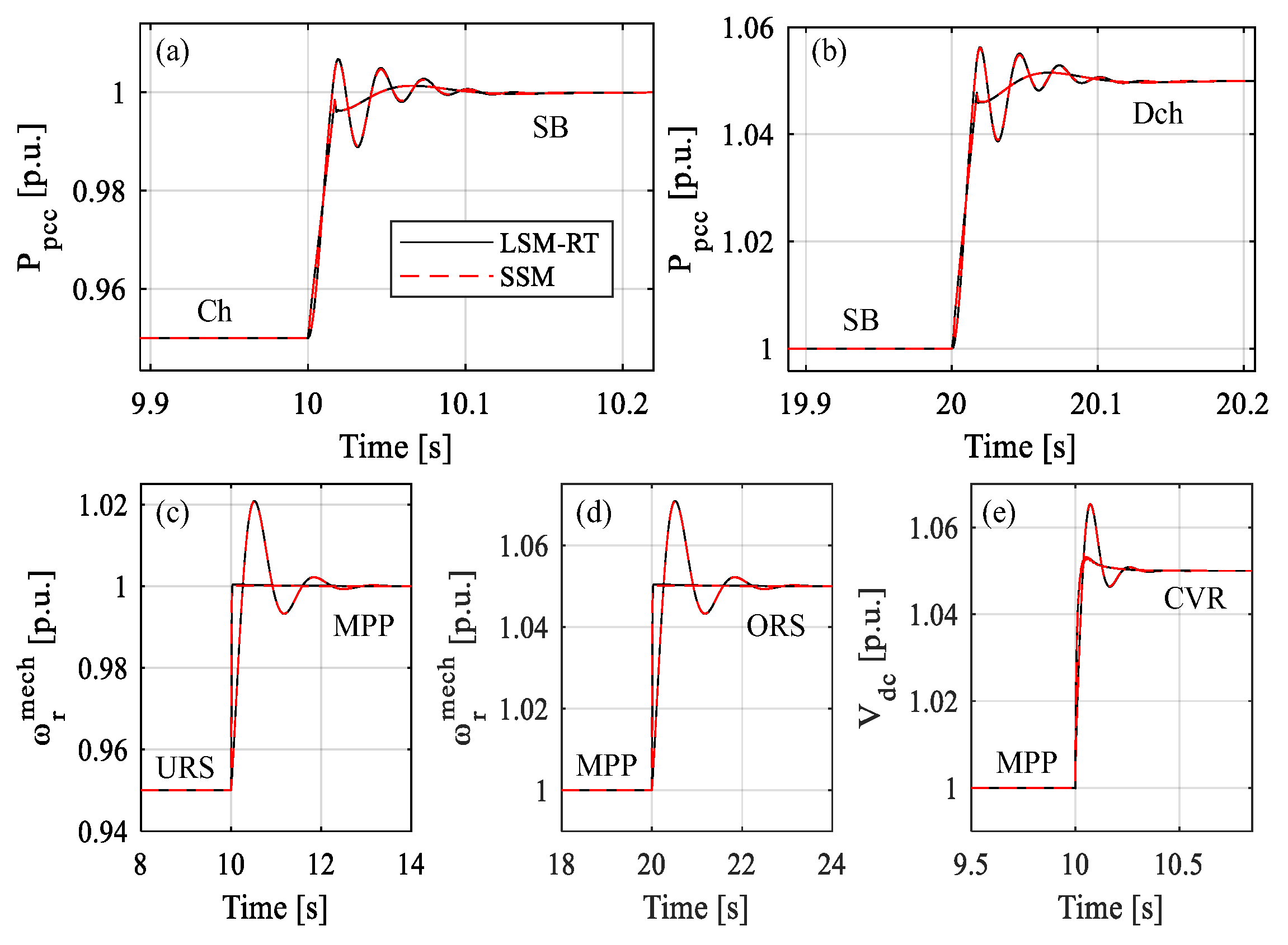Figure 14 compares real-time simulations of the LSM (TDLSM) and the SSM across key responses, such as grid-delivered power (