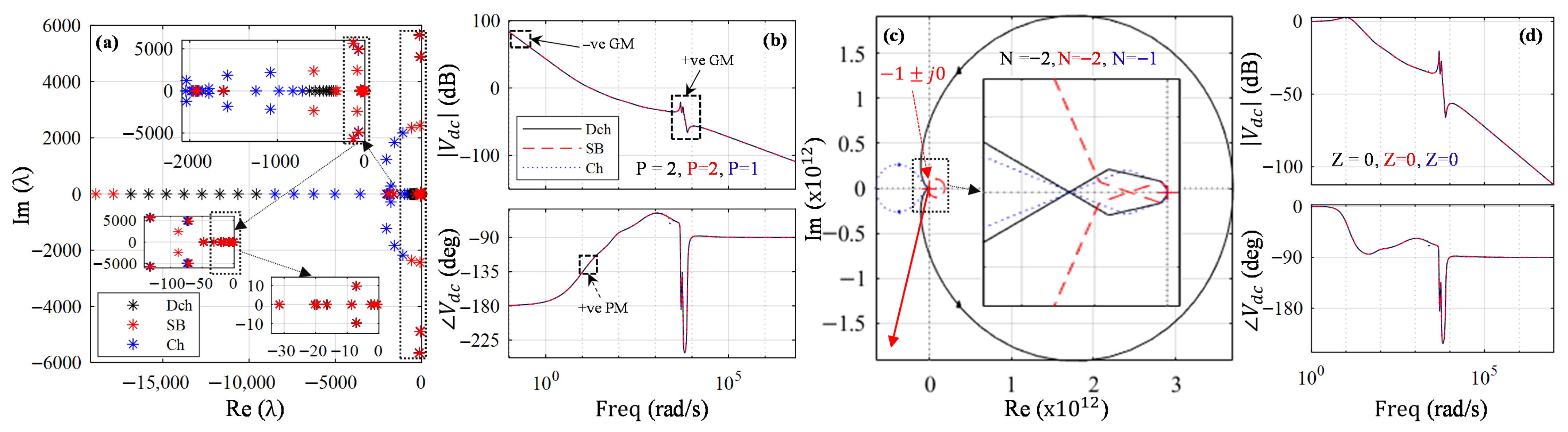 Figure 15b indicates the open-loop frequency response has RHP poles of P = 2, P = 2, and P = 1 during discharging (DCh), standby (SB), and charging (Ch) states, respectively. The corresponding clockwise encirclements in