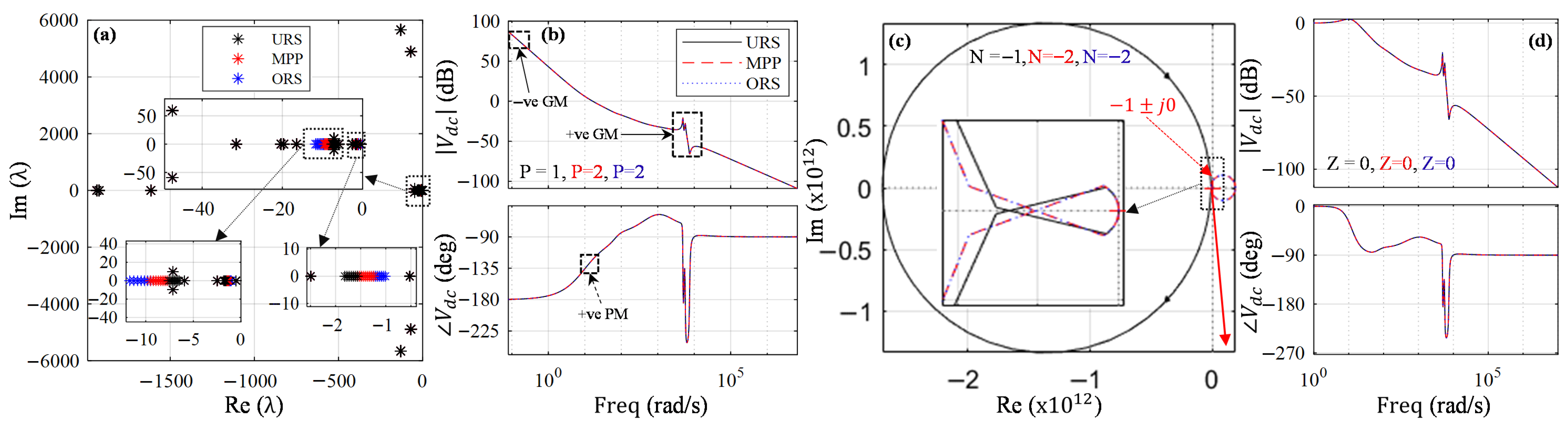 Figure 16b shows open-loop frequency response RHP poles as P = 1, P = 2, and P = 2 in URS, maximum-power-point (MPP), and ORS regions, respectively. Corresponding clockwise encirclements are N = −1, N = −2, and N = −2 in