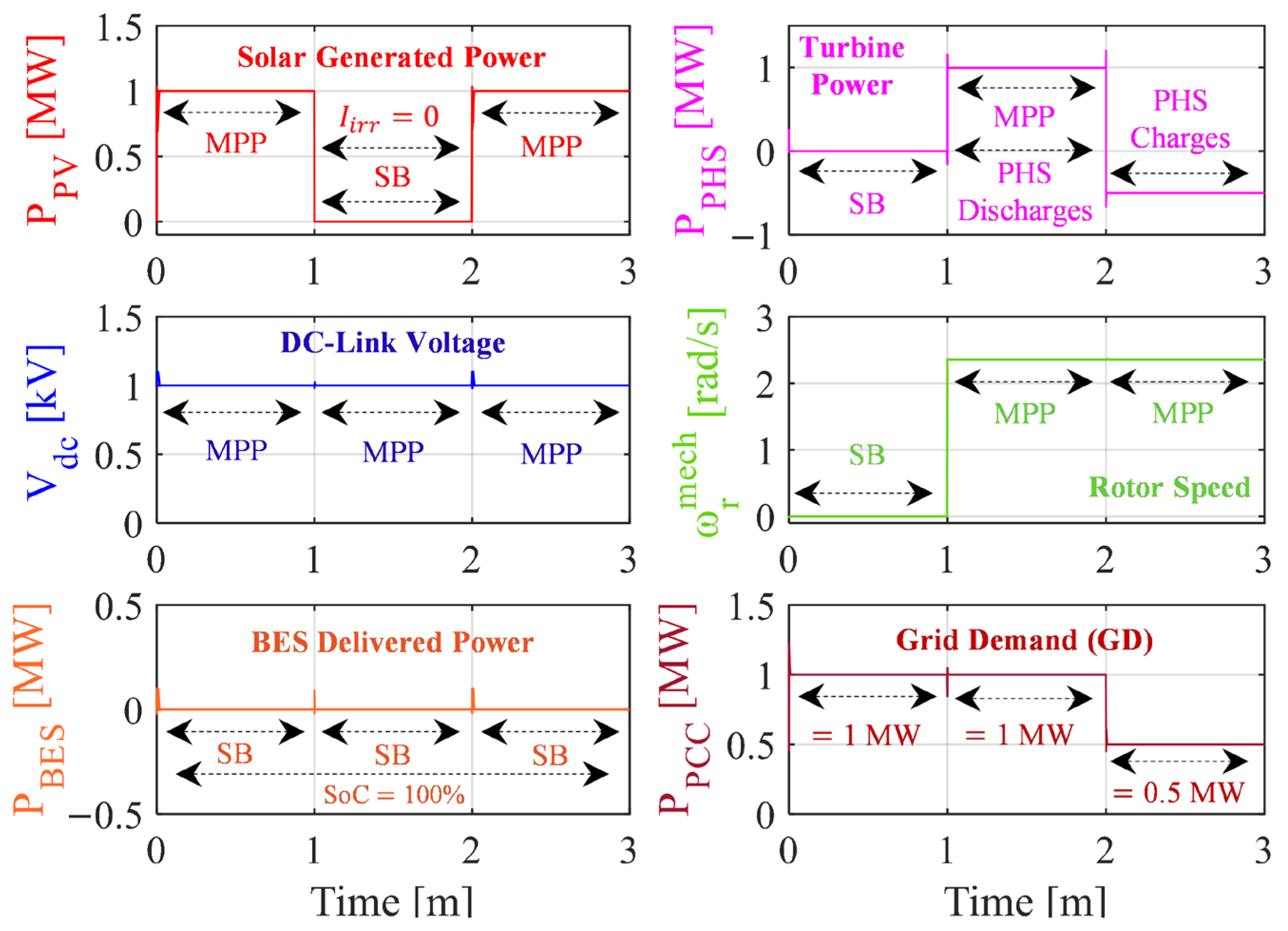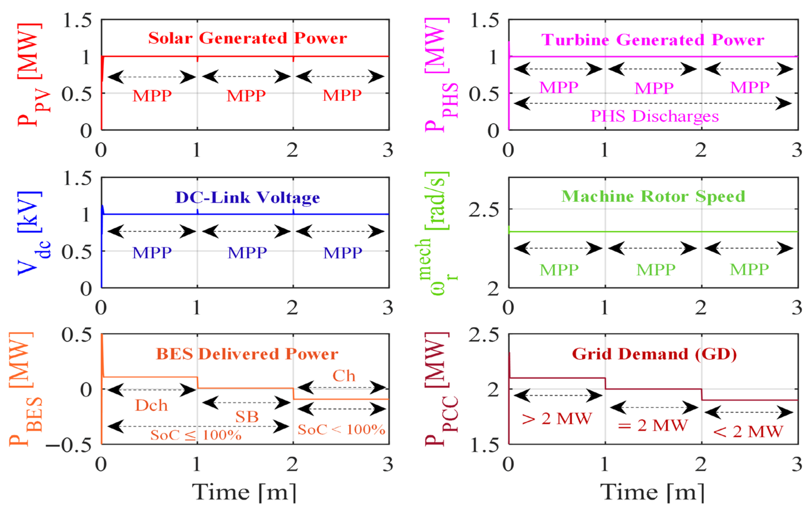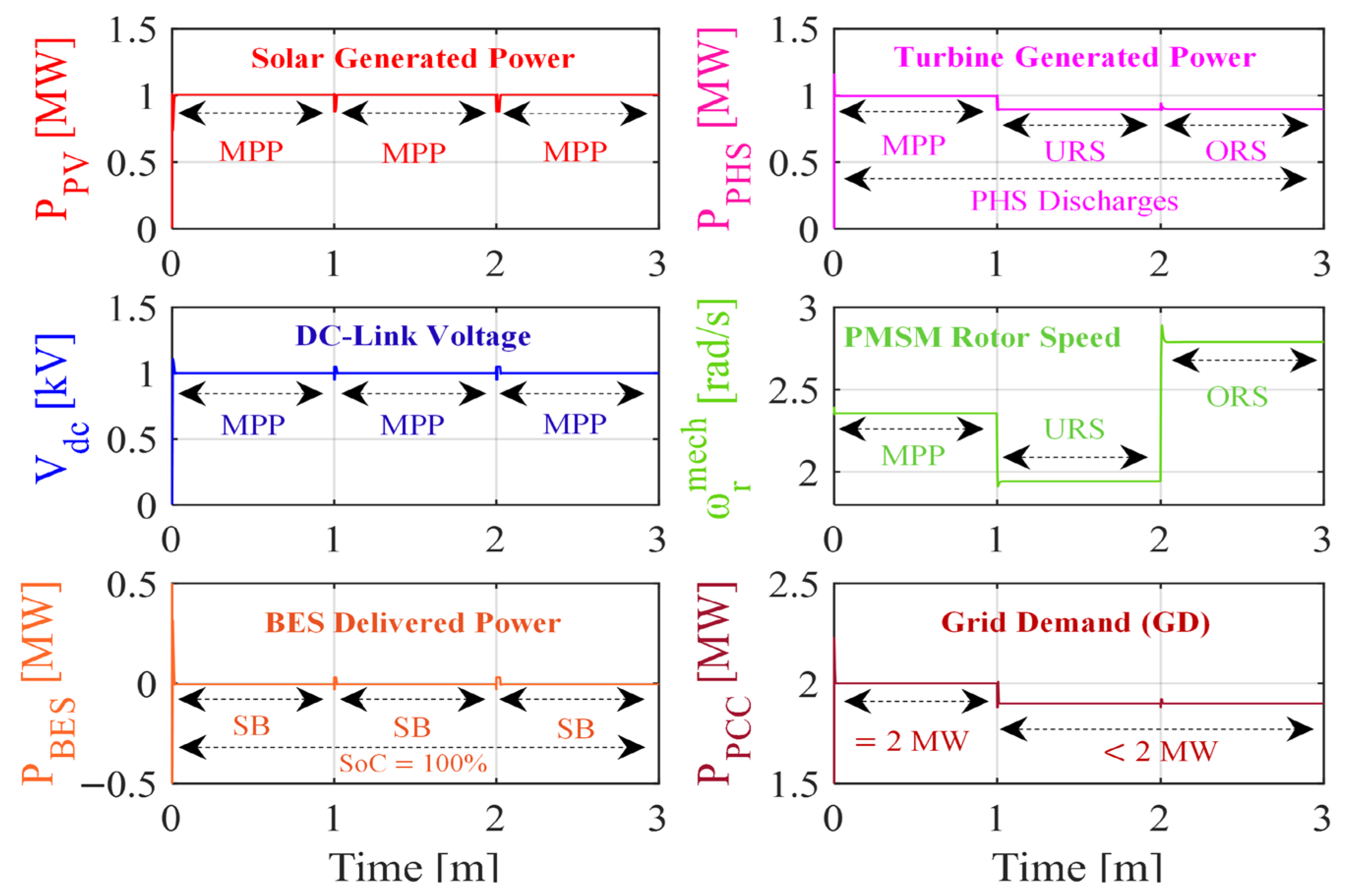 Figure 19 illustrates system performance across BES operating modes. During the interval from 0 to 1 min, the BES, with SoC ≤ 100%, supplements the maximum power of 2 MW generated by the PV and PSH units to meet the grid demand when it exceeds 2 MW. From 1 to 2 min, the BES, with SoC ≤ 100%, remains on standby, as the grid demand is fulfilled exactly at 2 MW by the combined PV and PSH output. Between 2 and 3 min, the BES, with SoC < 100%, absorbs excess power generated by the PV and PSH units when the grid demand drops below 2 MW.