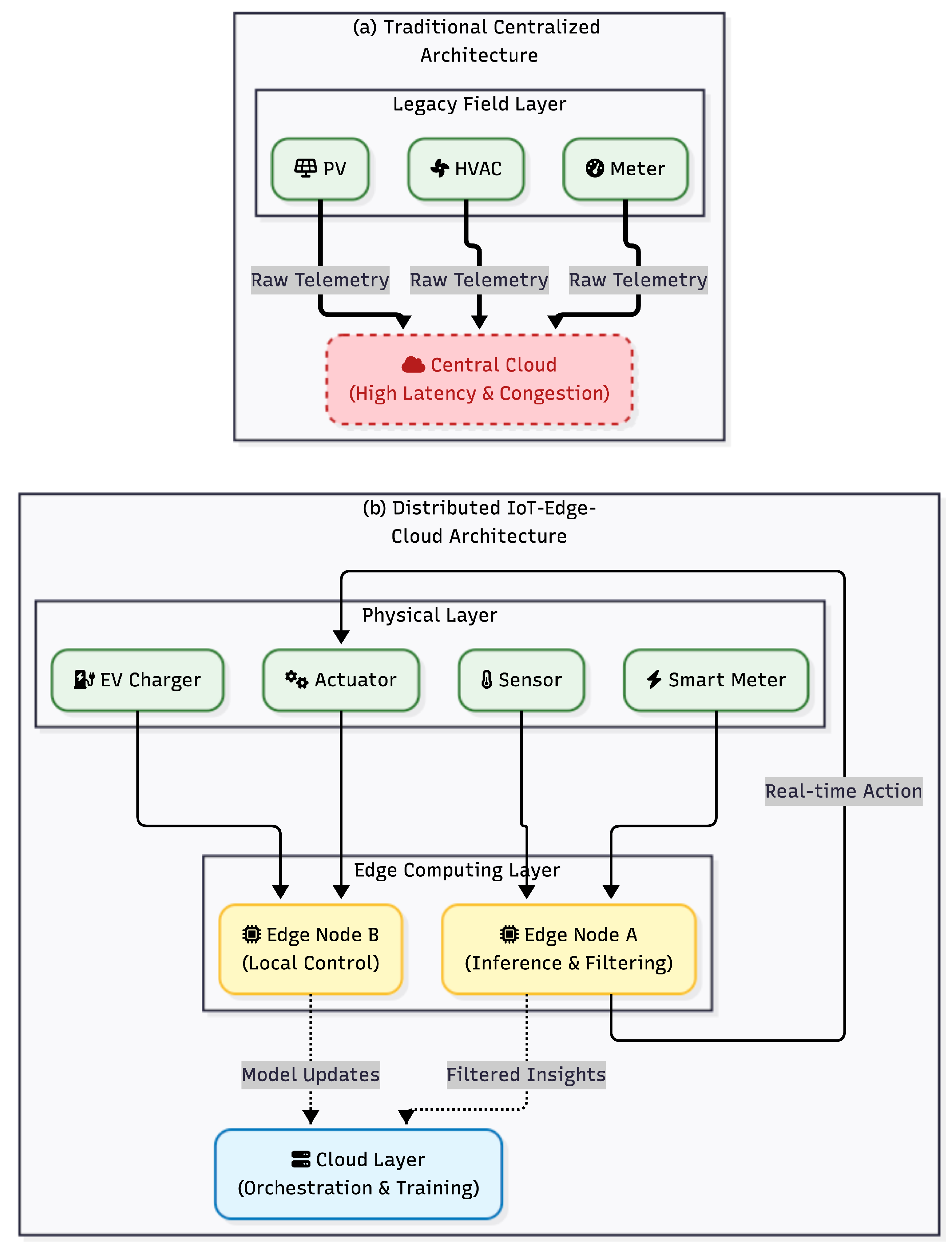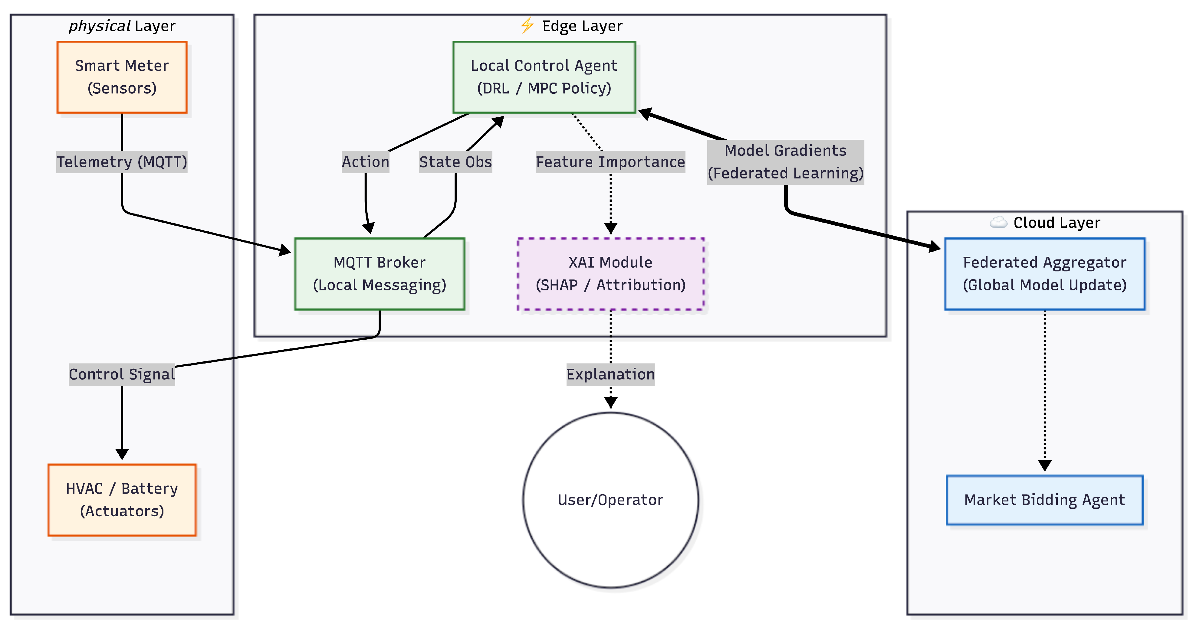 - Local Inference and Adaptation: The Edge Agent executes the Student model for real-time control. If site-specific performance drifts (e.g., due to unique occupancy patterns), the Edge agent performs “personalized fine-tuning” and uploads only the weight deltas back to the Cloud to update the Teacher [60].