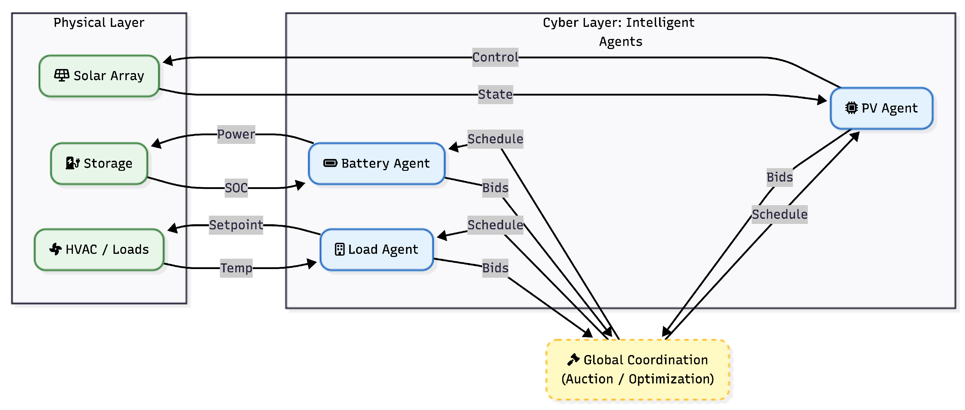 | District/Community MAS | Coordinated load shifting; shared storage optimization; cross-building flexibility [13,57,61]. |