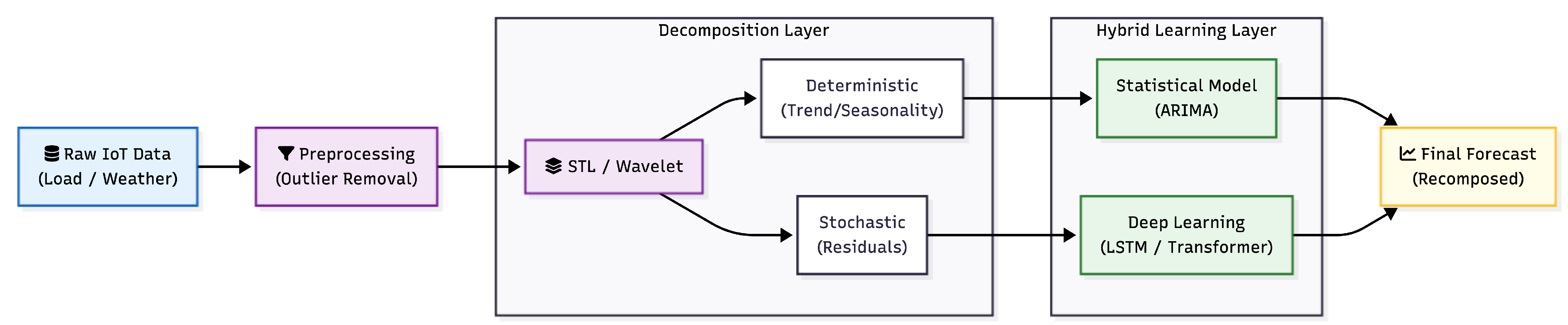 | Hybrid/Decomposition [23,35] | STL + ML, Wavelet + NN, EMD + RF | Requires decomposition + ML; medium–high computation | Medium–high (transparent deterministic part + ML residuals) | UBEM, systems with strong periodicity |