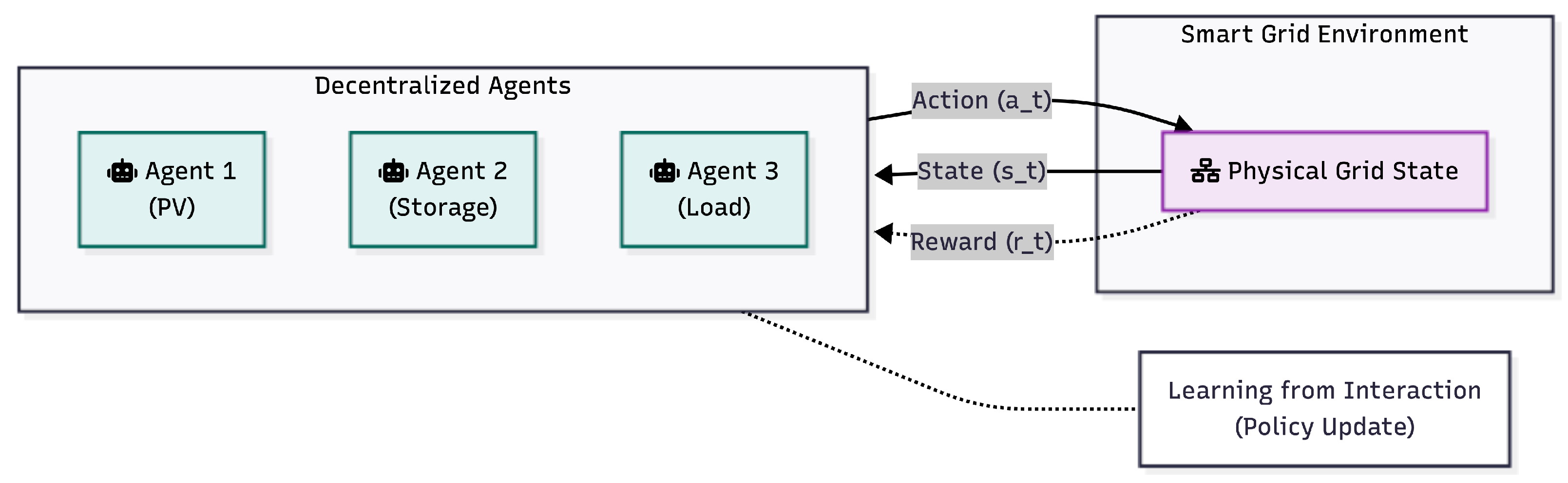| Reinforcement Learning/MARL [3,13,47] | Q-learning, PPO, DQN, MADDPG, MAPPO | Interaction/simulation data; high training cost, medium inference cost | Low (policies require XAI [6]) | Real-time control, EV coordination, storage dispatch, demand response |