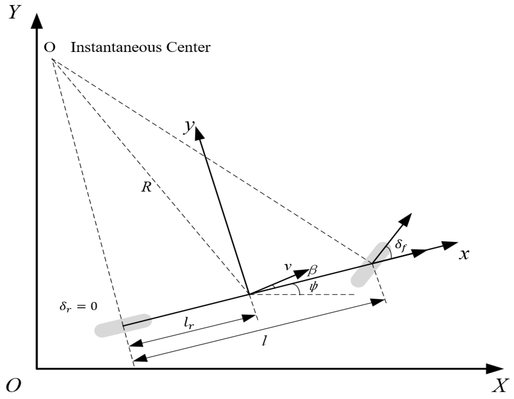 The left and right wheels on each axle are assumed to have identical steering angles and rotational speeds at any time, so that the two wheels on each axle can be lumped into a single equivalent wheel.