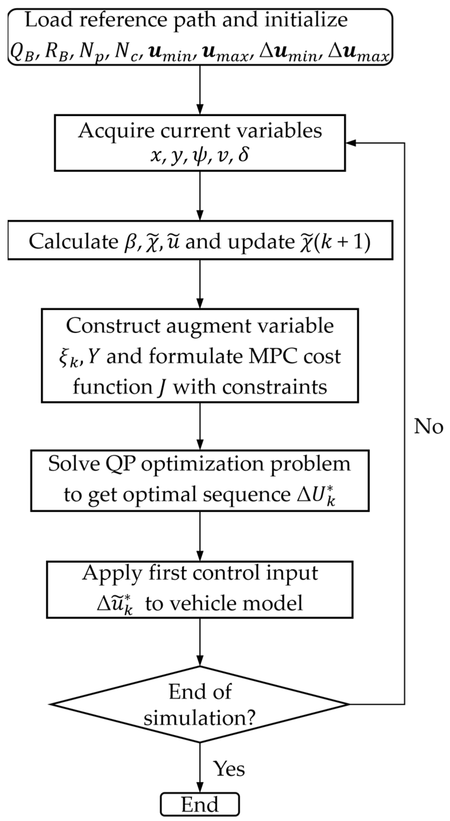 In the next control cycle, the prediction and optimization processes are repeated, thereby forming a receding-horizon control loop that continuously adjusts the control inputs to achieve accurate and stable vehicle path tracking.