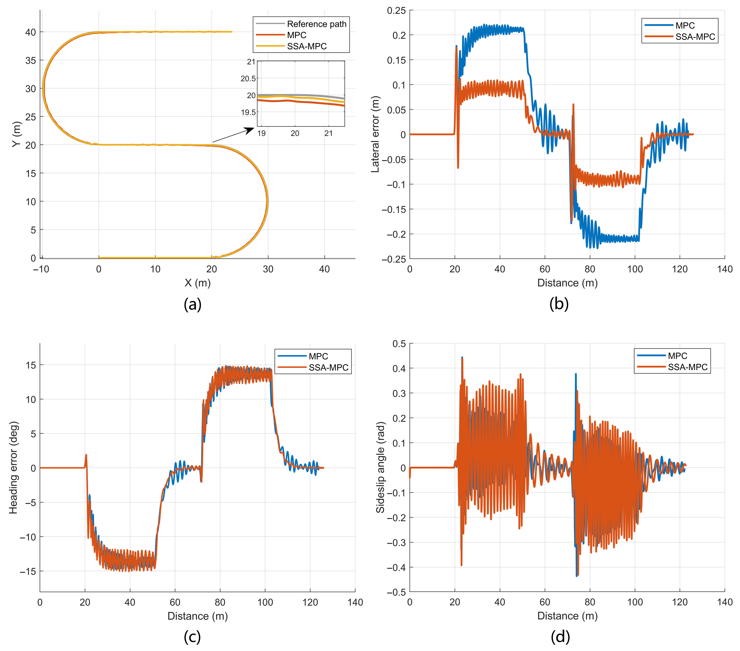 Figure 4b,c. Over the whole path, the absolute lateral error of SSA-MPC does not exceed 0.174 m, whereas that of MPC reaches 0.234 m, according to