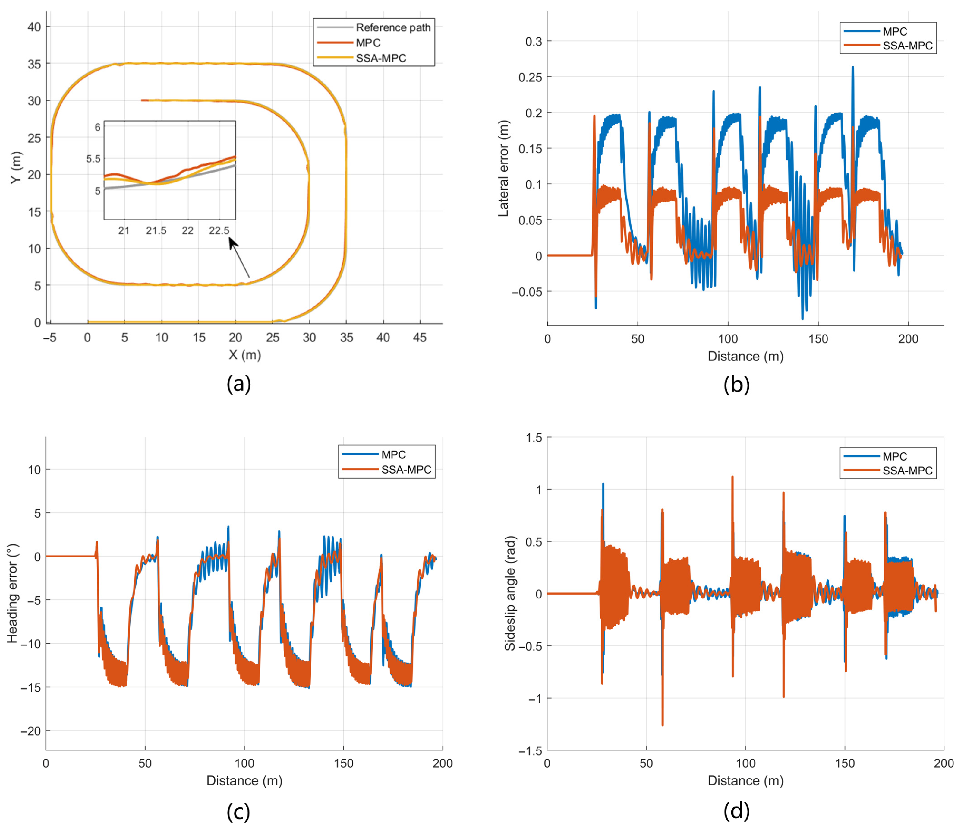 Figure 5b exhibit a periodic pattern, with one prominent peak produced at each cornering segment. Over the entire 200 m path, the lateral error of SSA-MPC remains within 0.194 m, whereas the maximum lateral error of MPC reaches 0.263 m. The corresponding heading error responses in