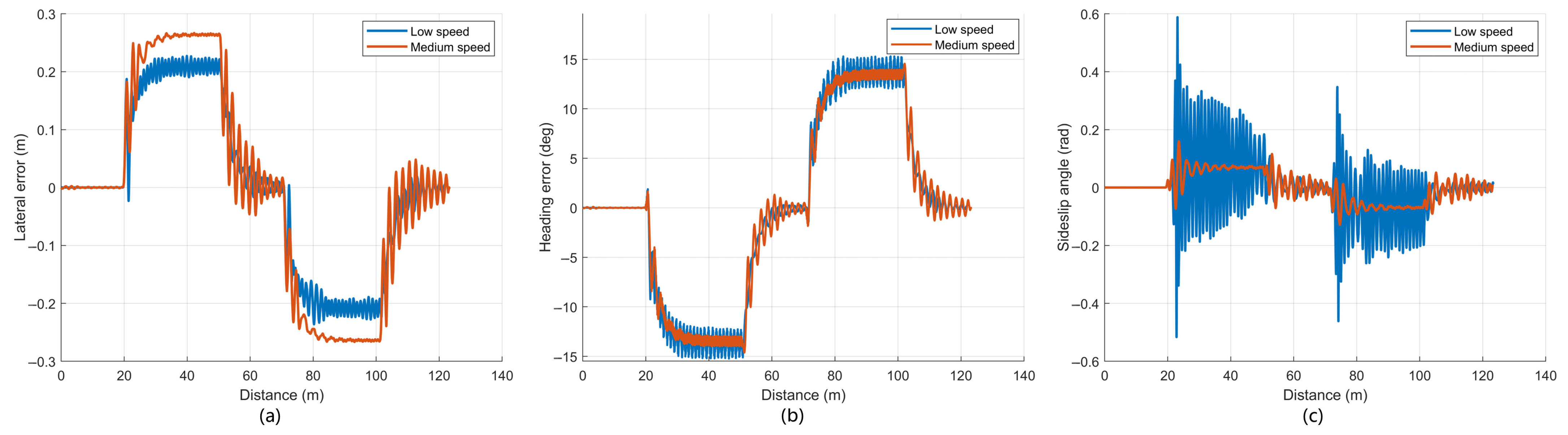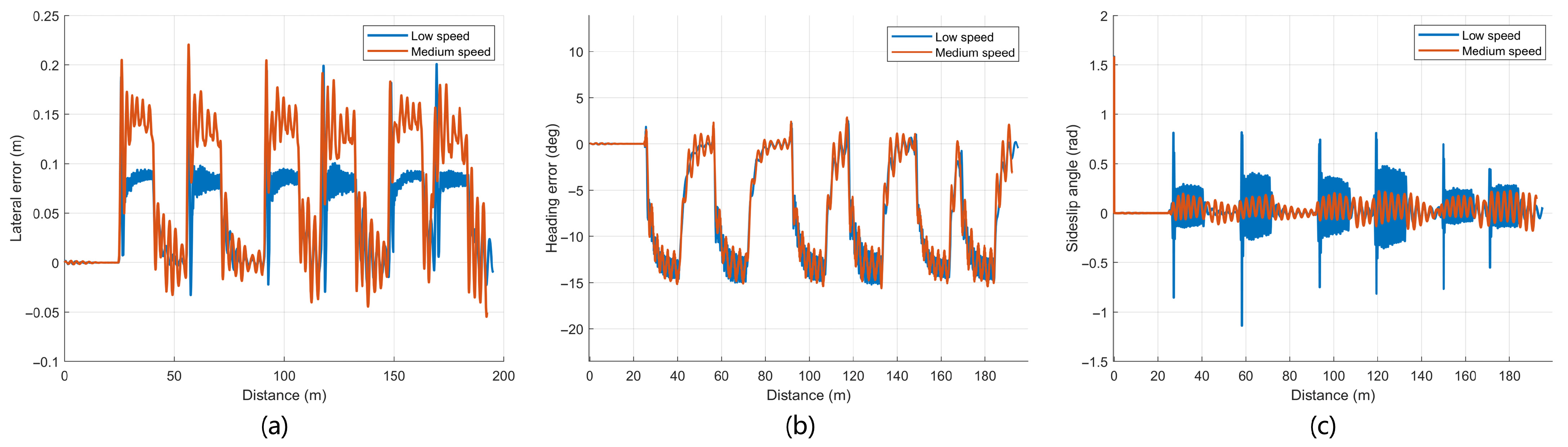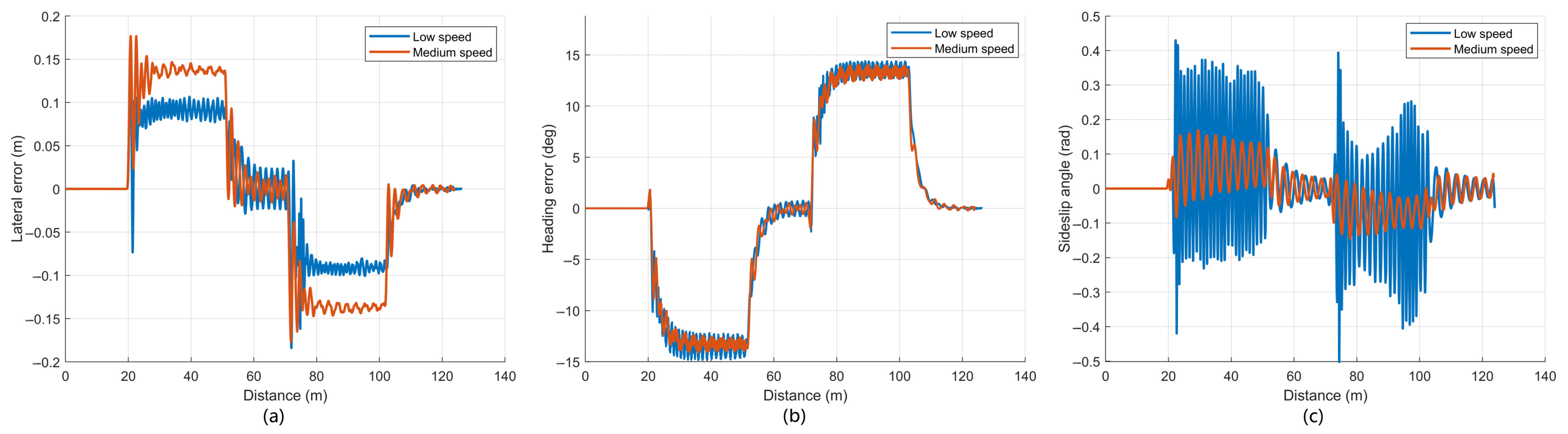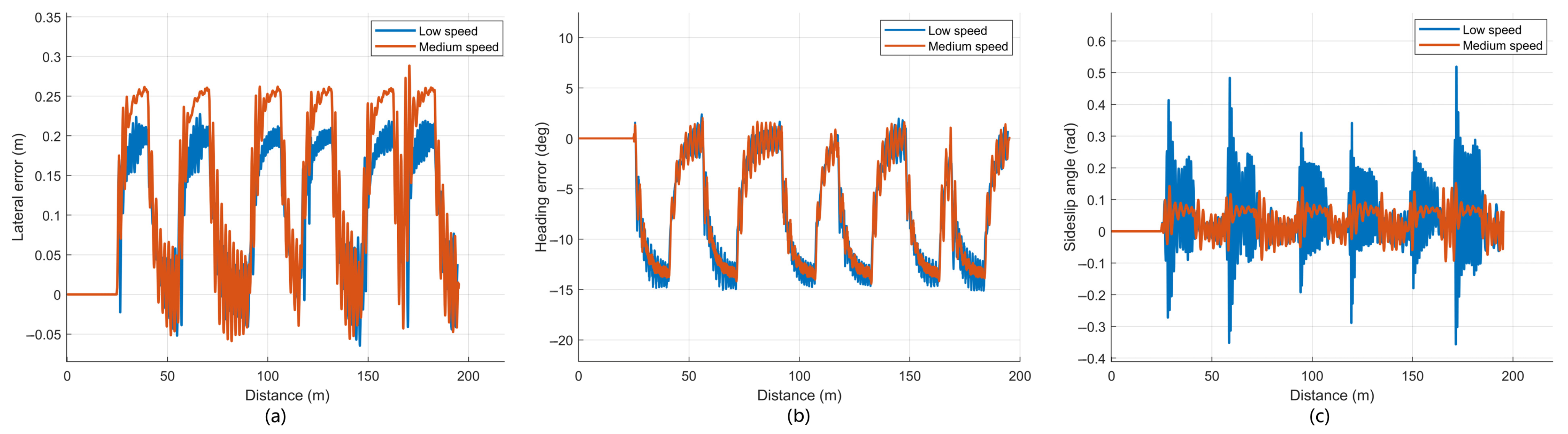 Figure 7, the lateral and heading errors also show periodic peaks at each turn. The absolute mean, standard deviation, and absolute maximum lateral errors are 0.145 m, 0.172 m, and 0.226 m at low speed, and 0.136 m, 0.182 m, and 0.276 m at medium speed. In both controllers, the sideslip angle remains close to zero for most of the trajectory and exhibits pronounced fluctuations mainly in the curved segments, with larger amplitudes at the higher speed.