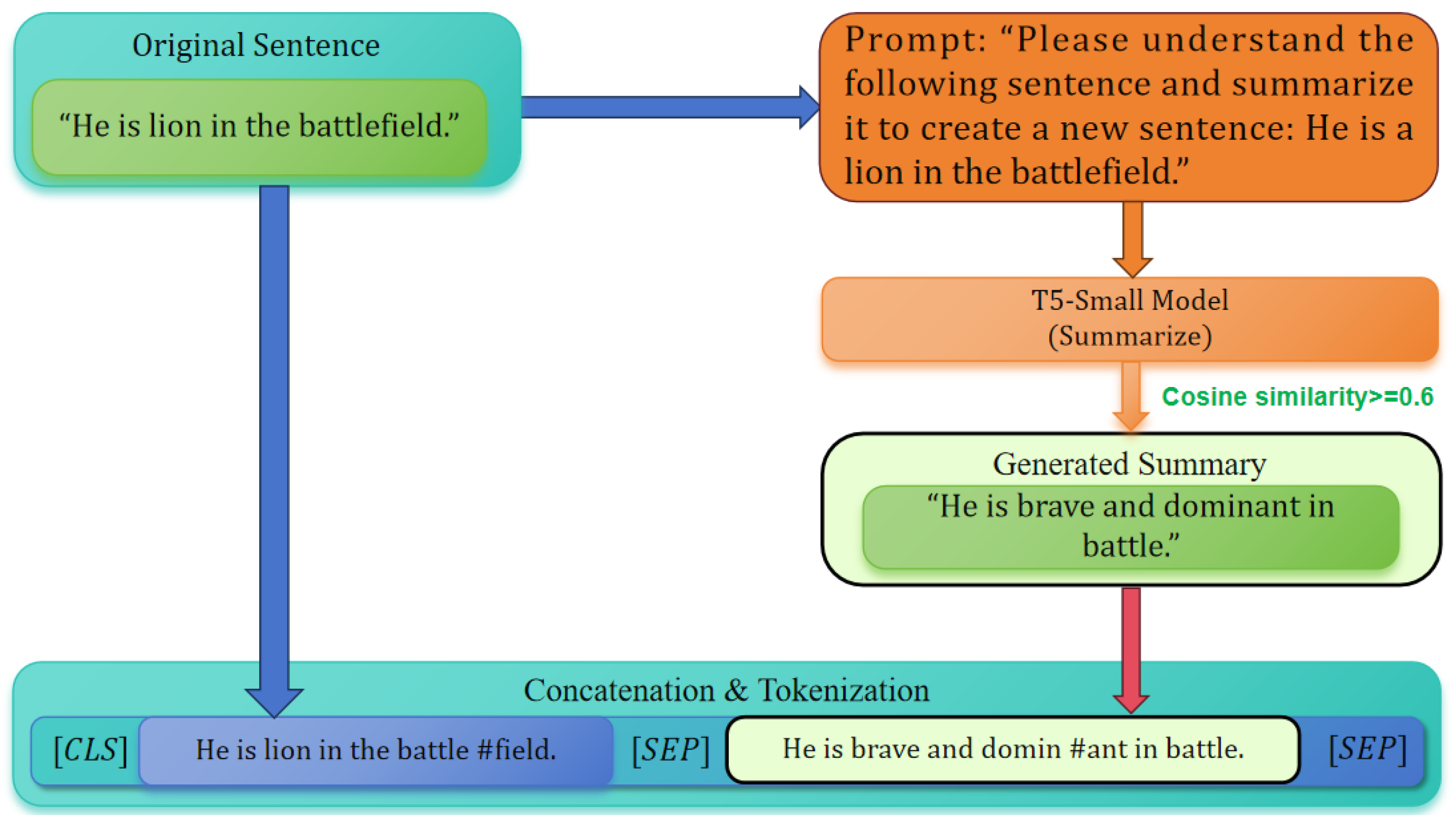 Figure 4 illustrates the workflow of generating summaries with T5-small and concatenating them with the original sentences. The figure provides a complete data augmentation example, including the specific sentence–summary pair, the prompt, and the concatenation strategy. It is important to note that after concatenation, the original contextual information of the sentence is fully preserved. The role of the summary is not to introduce additional context, but to provide a clearer and more explicit form of semantic anchoring. To ensure summary quality, we measure the semantic similarity between the original sentence and its generated summary, and retain only summaries with a cosine similarity of at least 0.6. If the similarity score falls below this threshold, the original sentence is used as the summary for concatenation. Finally, we randomly sample 1000 generated summaries, whose average sentence length is 17.8 words. Taking the VUA Verb