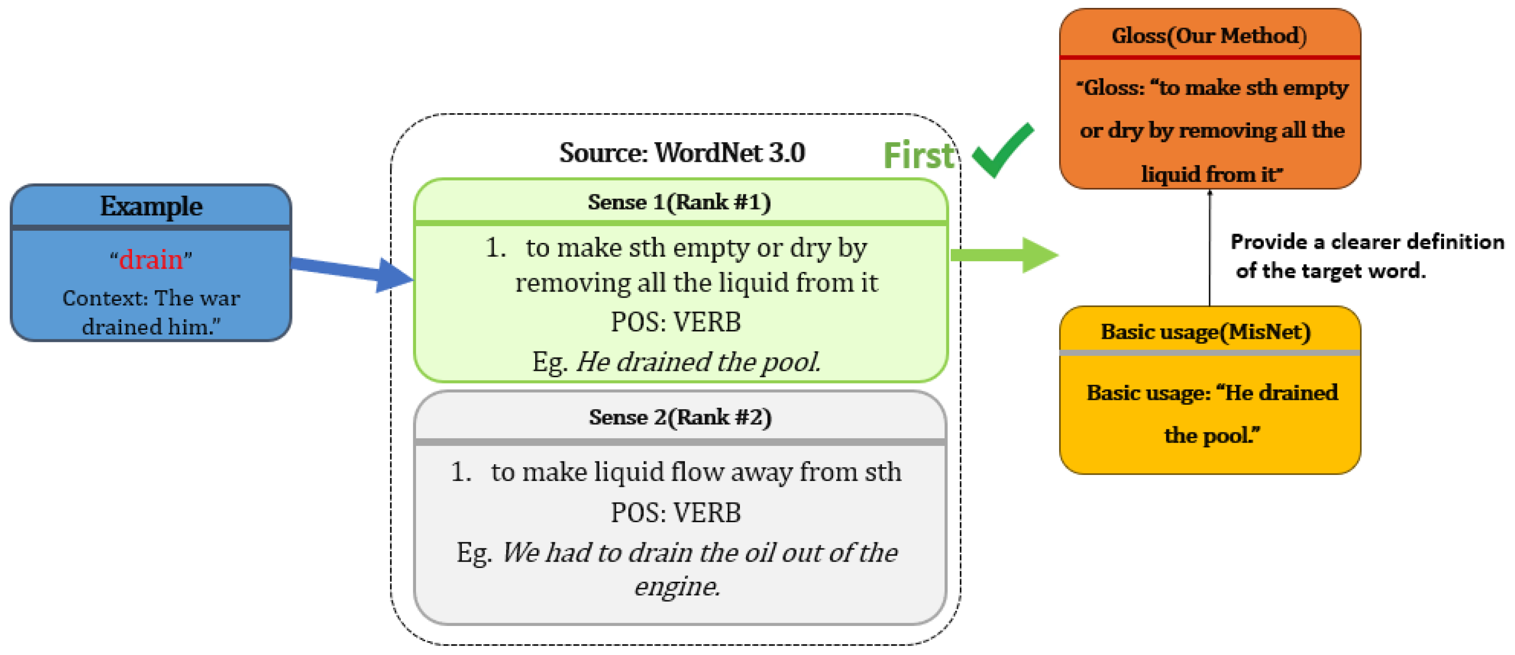 5] employs the basic usage of a word to represent its literal meaning in order to handle novel metaphors. However, for conventional metaphors, the usage of the word often does not differ significantly from its basic meaning. Therefore, a more abstract and conceptual representation of the target word is required to better distinguish it from its contextual usage. To address this limitation, we extend MisNet by incorporating gloss information, which provides a more abstract and conceptual description than basic usage, enabling the model to better capture conventional metaphors.