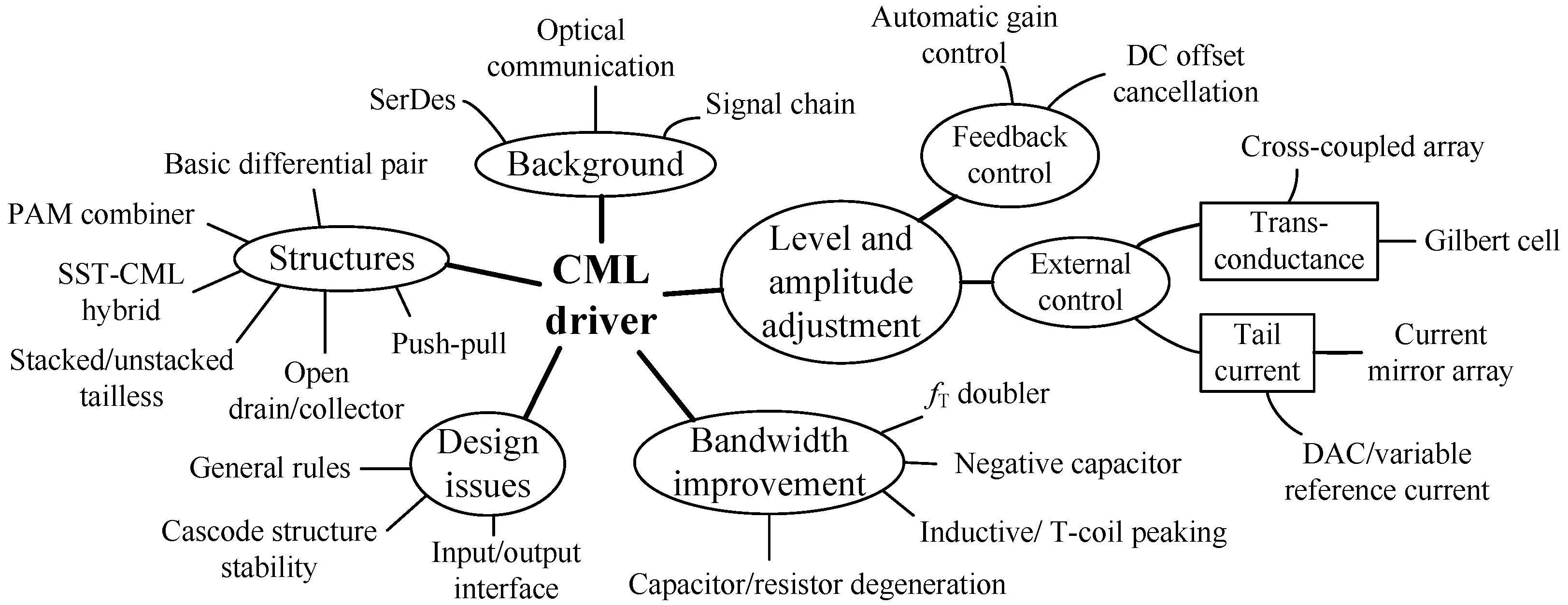 - Architecture and technique. Some driver ICs only amplify the input signal, so their structures typically comprise VGA, EQ, PreAmp, and output driver. Some transmitter ICs incorporate additional functions such as multiplexing and PAM4 encoding, so their architectures include serializers. Most designs focus on innovations in equalization, bandwidth expansion, gain control, and termination strategies, resulting in improvements in equalizer tuning range, driver linearity, data rate, and power efficiency. Notably, equalizers have become essential in modern communication systems to extend the system-level channel capacity. Among the diverse equalizer architectures, CTLE and FFE are most commonly integrated in CML drivers and transmitters. Structured as a digital or analog high-pass finite impulse response (FIR) filter, FFE increases complexity, power, and area compared to CTLE, but it can be precisely tuned to counteract the loss of a known channel without amplifying noise.