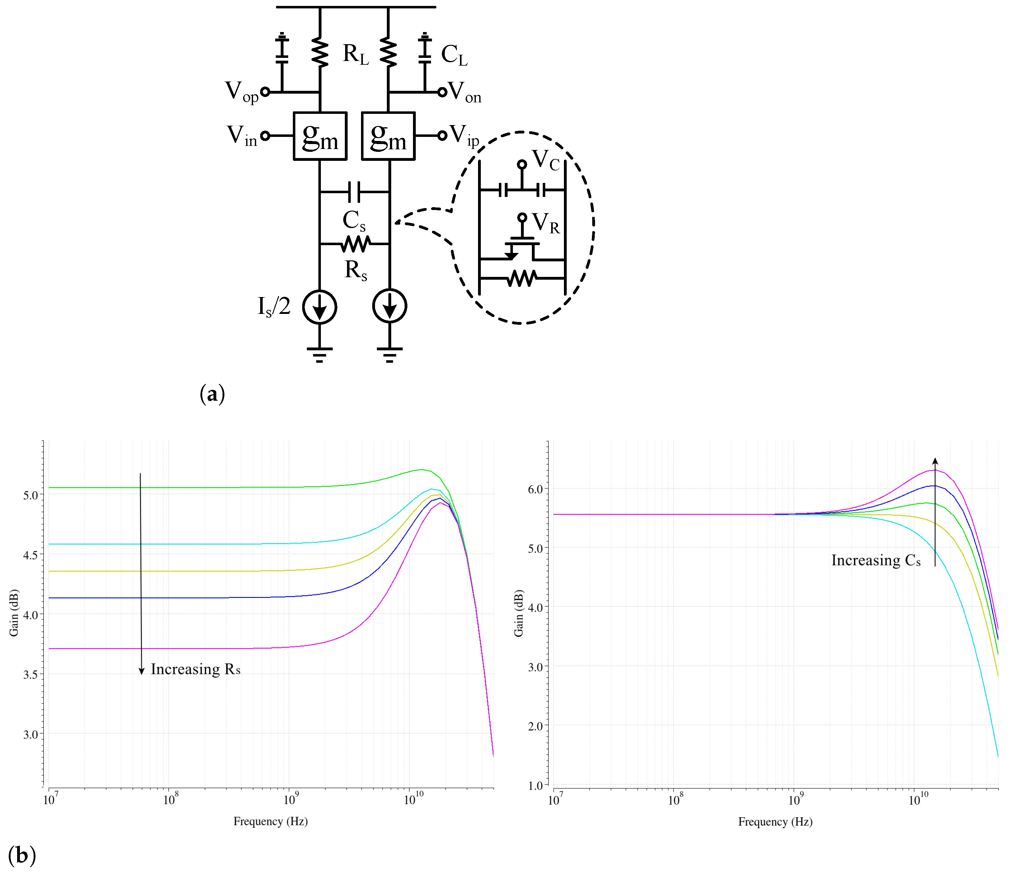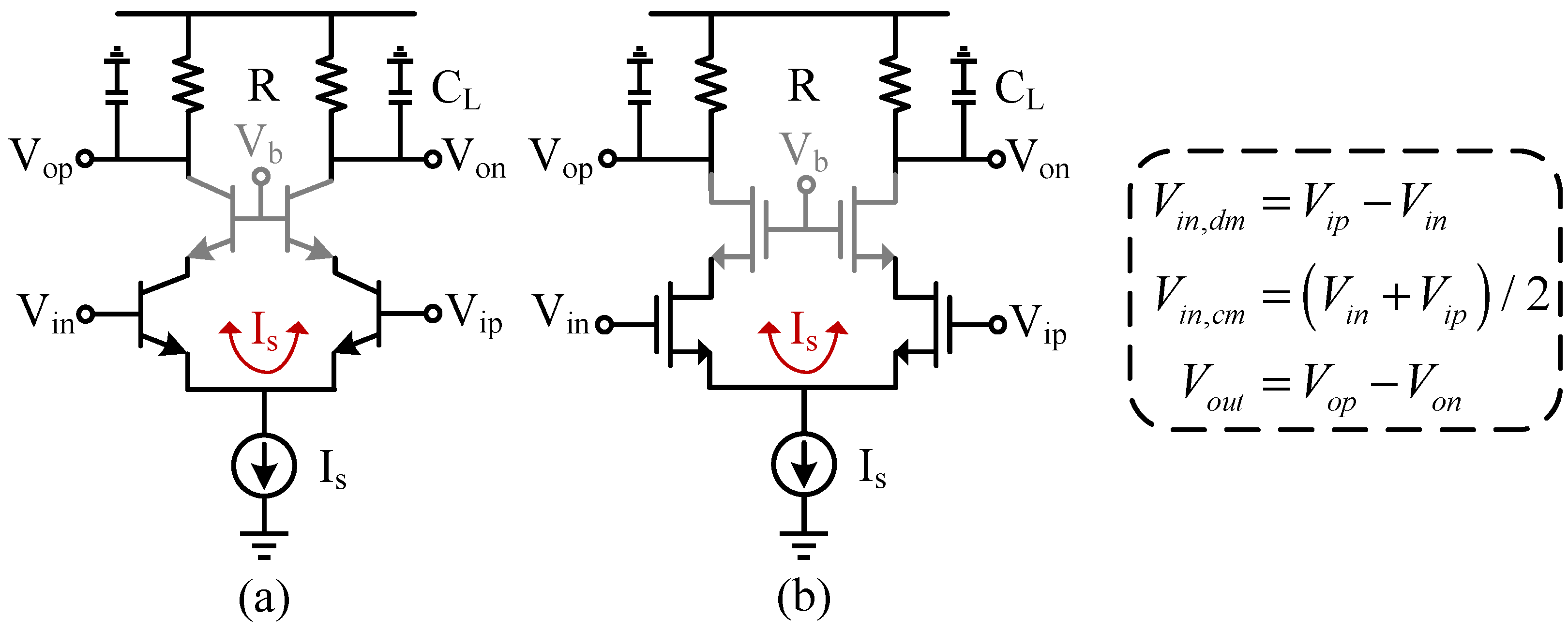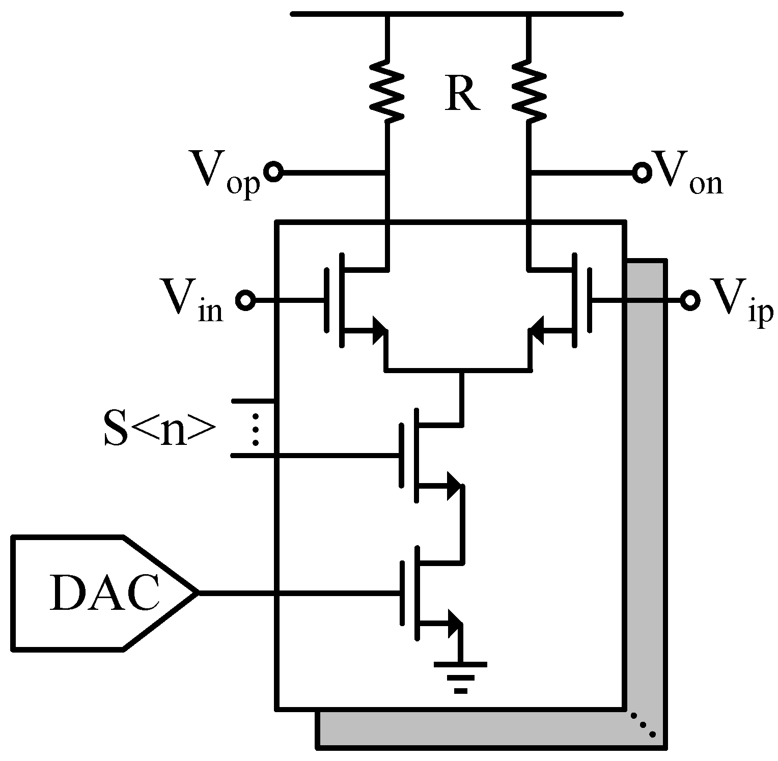 - Wiring: single-ended or differential. If the load is single-ended, only one terminal is connected out, which is not conducive to the balance of current signals flowing across differential branches. Integrating a dummy load to another terminal is a feasible solution. An unbalanced CML structure can also be adopted to fit the DC point and AC performance with a specific load [9,10]. For CMOS technologies scaling down to 7 nm or below, differential connection is more essential given the limited voltage headroom below 0.8 V.