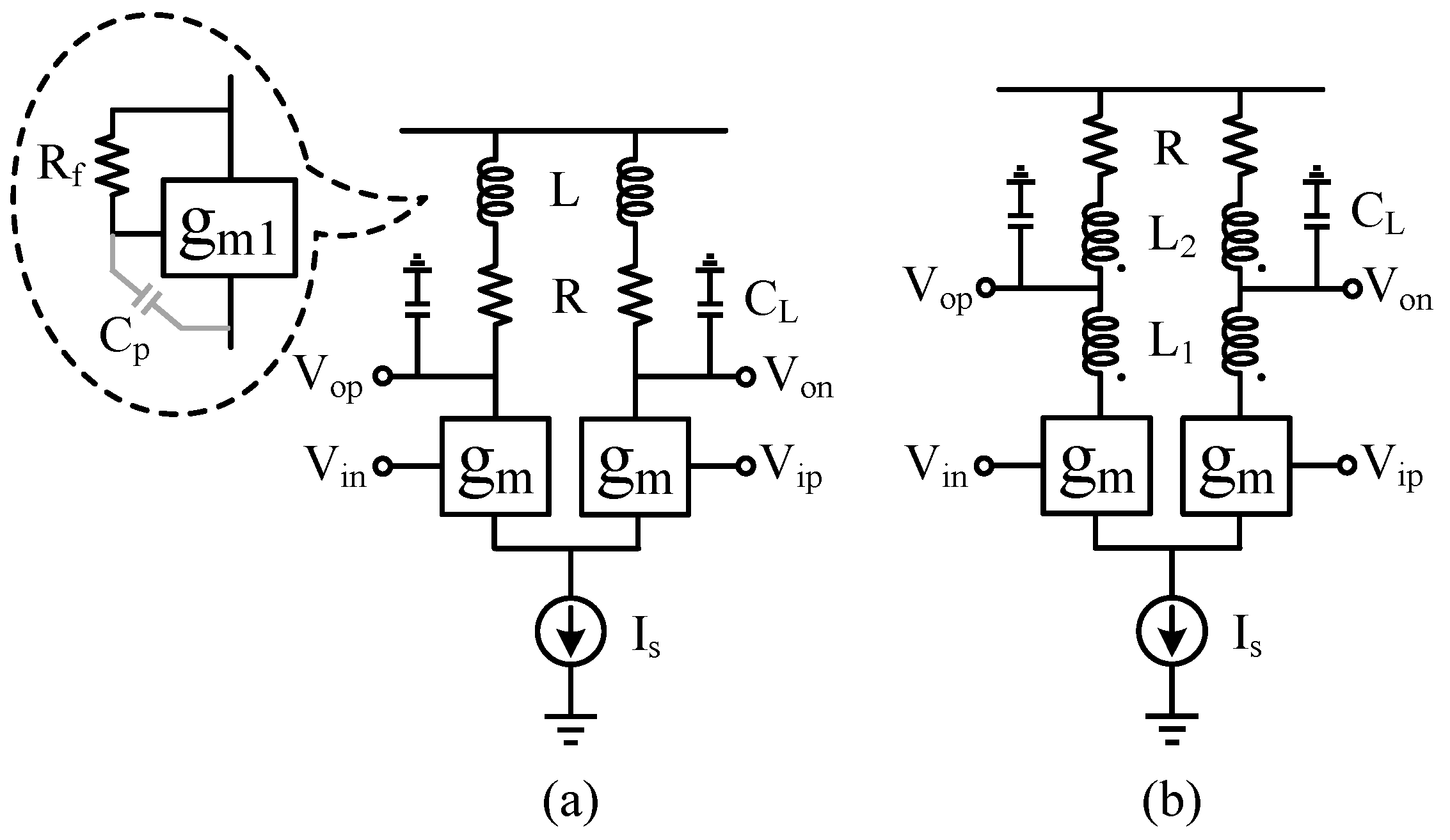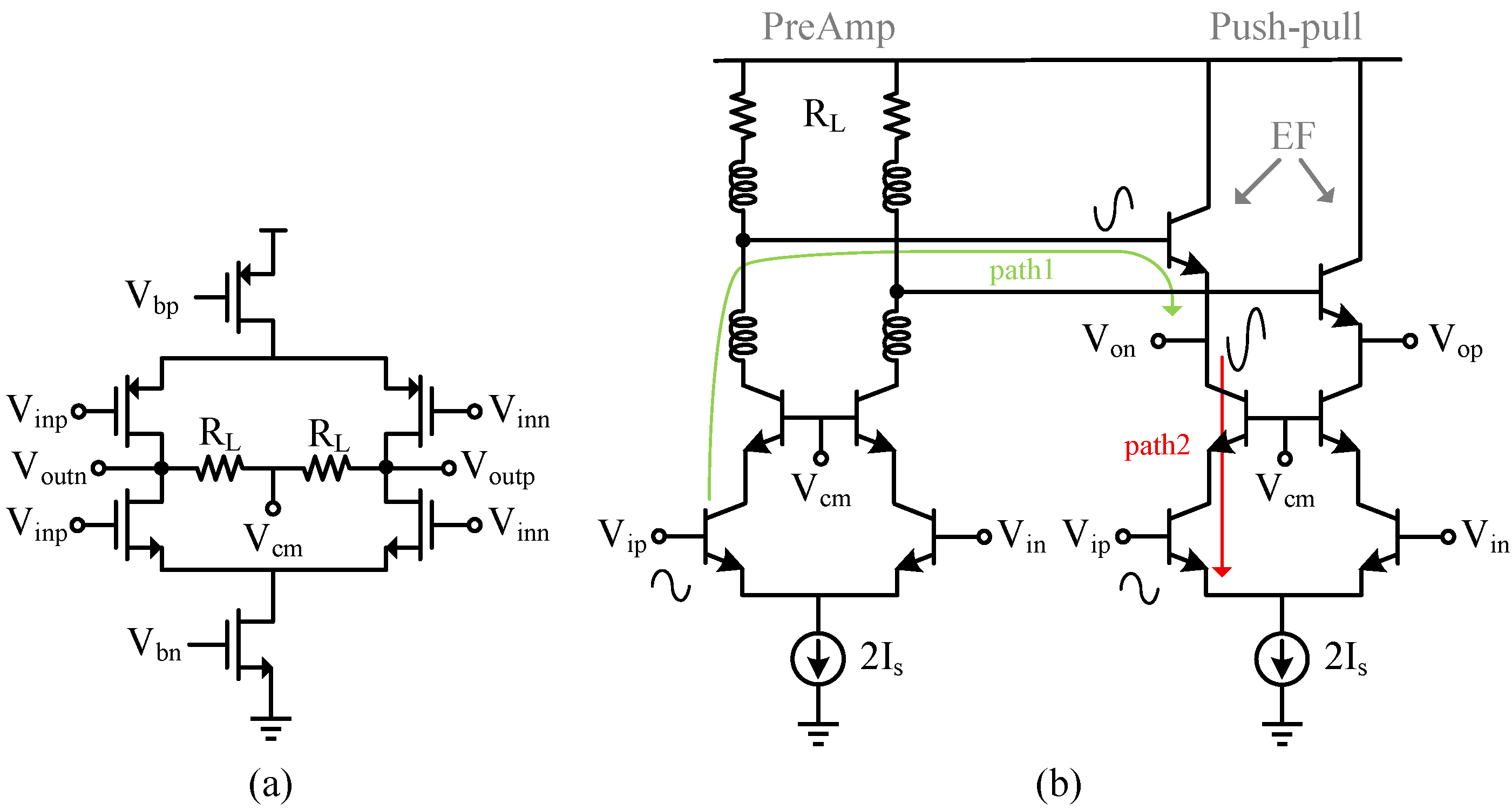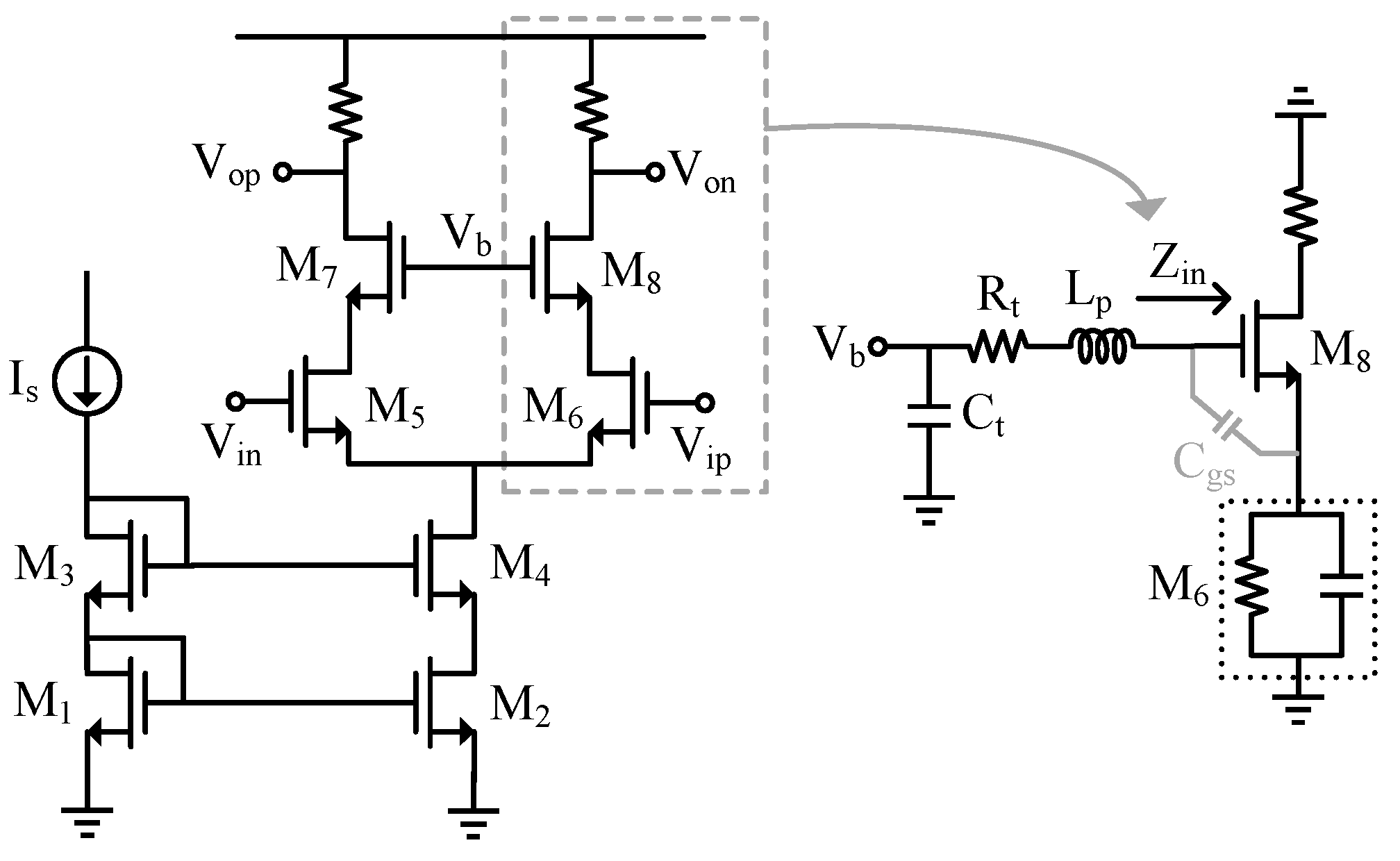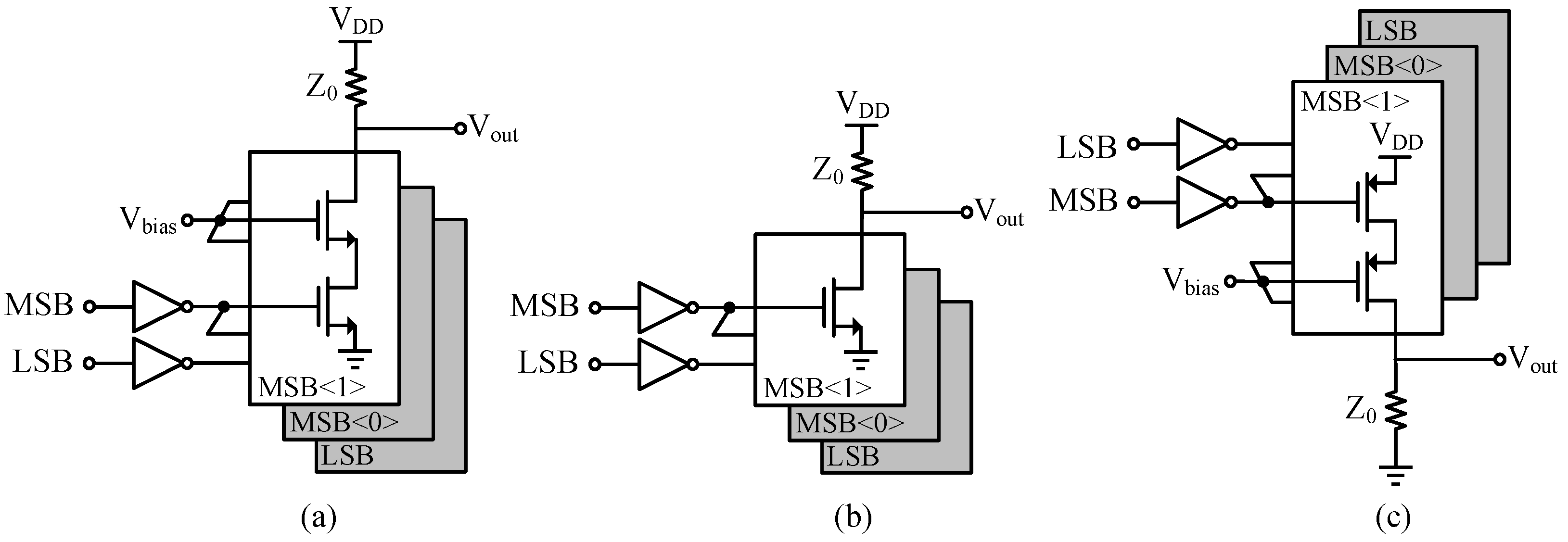 - Wiring: single-ended or differential. If the load is single-ended, only one terminal is connected out, which is not conducive to the balance of current signals flowing across differential branches. Integrating a dummy load to another terminal is a feasible solution. An unbalanced CML structure can also be adopted to fit the DC point and AC performance with a specific load [9,10]. For CMOS technologies scaling down to 7 nm or below, differential connection is more essential given the limited voltage headroom below 0.8 V.