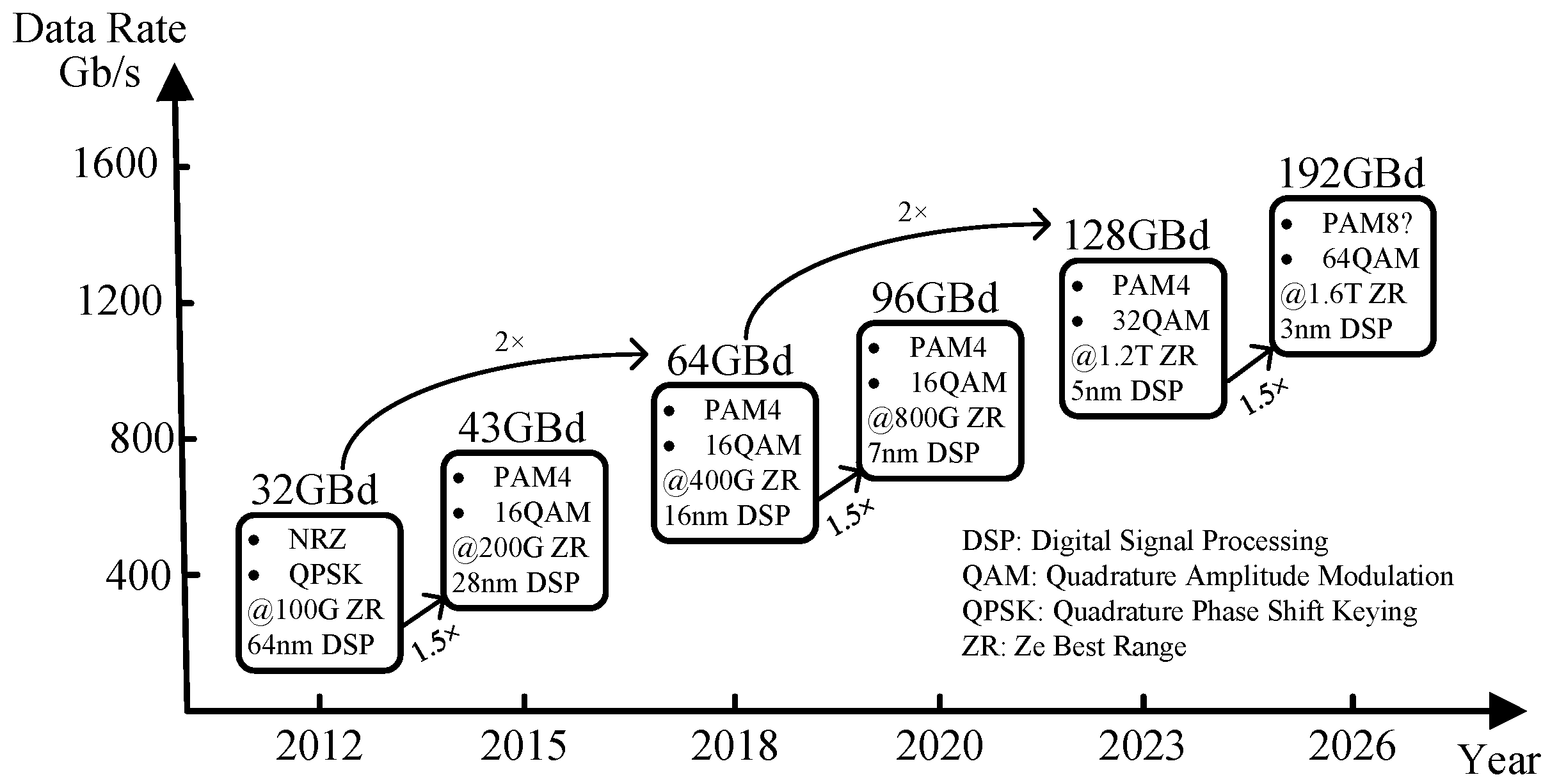 - Data rate. Basically, the maximum achievable data rate is limited by the transistor’s cut-off frequency , unless numerous bandwidth extension techniques are adopted, whereas PAM4 and PAM8 signal modulation reduce bandwidth demand with minimal increases in circuit complexity, thereby improving power efficiency (FoM).