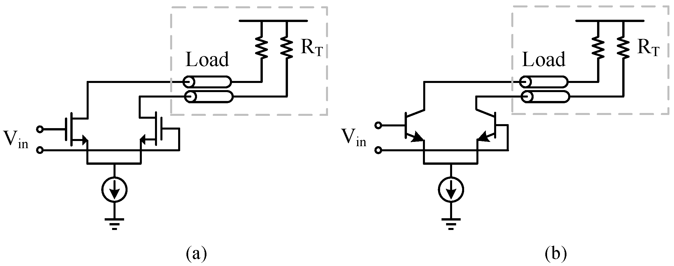 - Impedance matching. Regardless of the coupling and wiring method, it is crucial to maintain the continuity of the characteristic impedance on the signal transmission link. For a standard circuit system, the terminating resistor R is fixed to 50 , and the output amplitude is determined by the tail current. But drivers used for optical modulators and other non-electrical devices have a non-standard load impedance. For load characteristic impedance higher than 50 , the terminating resistor R can be set higher to match output load and lower tail current while maintaining the same output amplitude [11]. If the characteristic impedance is very low, on the other hand, the implementation of high-swing CML drivers is very power-consuming. Optimized structures such as push–pull CML can be adopted to improve the driving strength. The driver structures suitable for different load characteristics are described in Section 5.