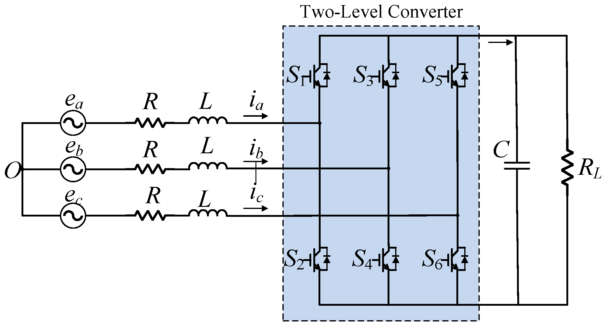Figure 1 illustrates the configuration of the three-phase AC/DC converter considered in this study. The converter is supplied by a balanced three-phase AC source, represented by phase voltages