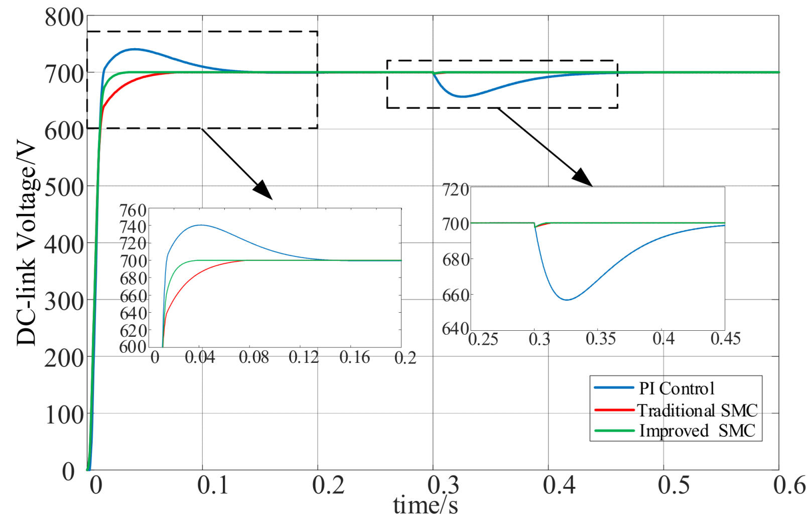 To ensure a fair comparison, the outer voltage-loop dynamics of the PI controller, the conventional SMC, and the proposed SMC were designed to exhibit comparable response characteristics. The voltage-loop bandwidth was selected within a similar range for all control strategies, corresponding to a comparable DC-link voltage settling time.